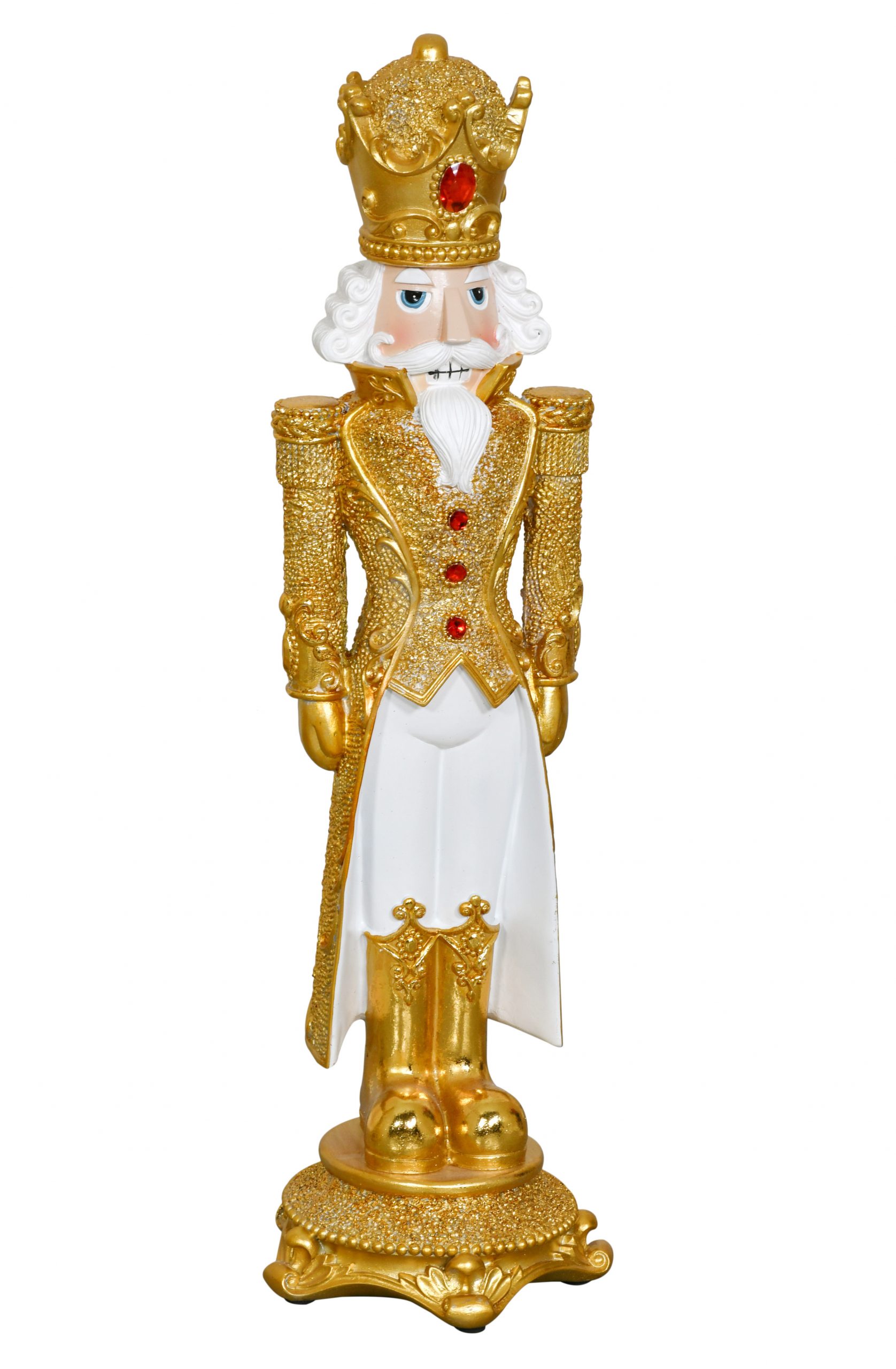 This majestic 24-inch tall figurine exudes regality and the timeless charm of holiday tales. Clad in a sparkling golden uniform with meticulously detailed embellishments, it stands as a symbol of festivity and tradition. The figure’s stately crown, accented with crimson jewels, complements its benevolent expression, inviting stories of old to the modern home. It’s a decorative piece that commands attention, whether placed by a hearth or as the centerpiece of a holiday display, bringing a sense of nostalgia and wonder to every glance. This figurine is more than just a decorative object; it’s a cherished heirloom in the making, sure to evoke the magic of the season year after year.