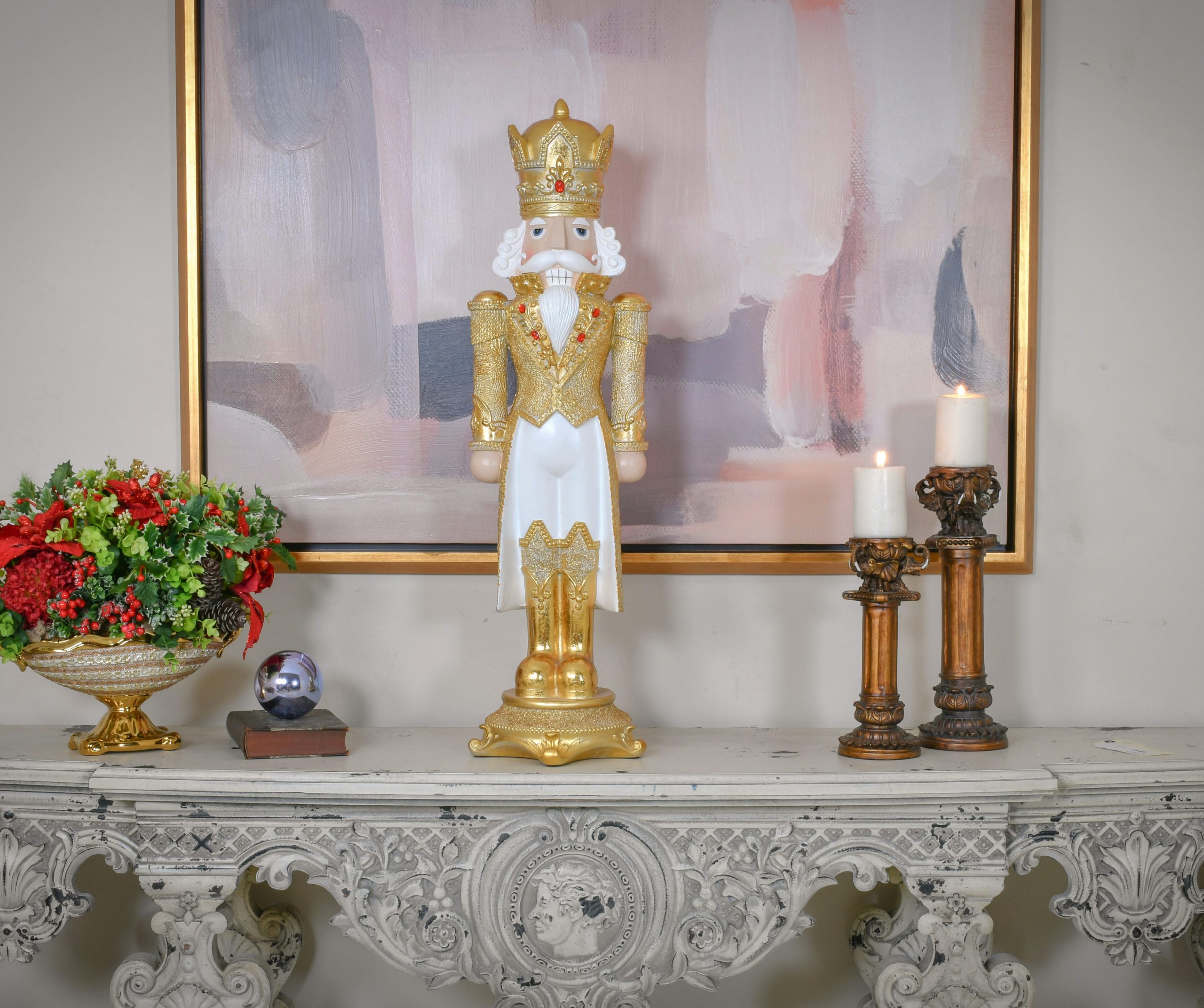 This majestic 36-inch nutcracker figurine is a resplendent statement piece, clad in gleaming gold regalia. His royal attire is meticulously detailed, from the gilded buttons lining his coat to the crown perched atop his wise, white-haired head. Standing on a matching pedestal, this nutcracker embodies the opulence and grandeur of a bygone era, bringing an air of nobility and splendor to any space it graces. With its impressive height and commanding presence, this piece is not just a holiday decoration but a year-round symbol of elegance and authority, perfect for adorning a stately room or serving as the centerpiece of a festive display.