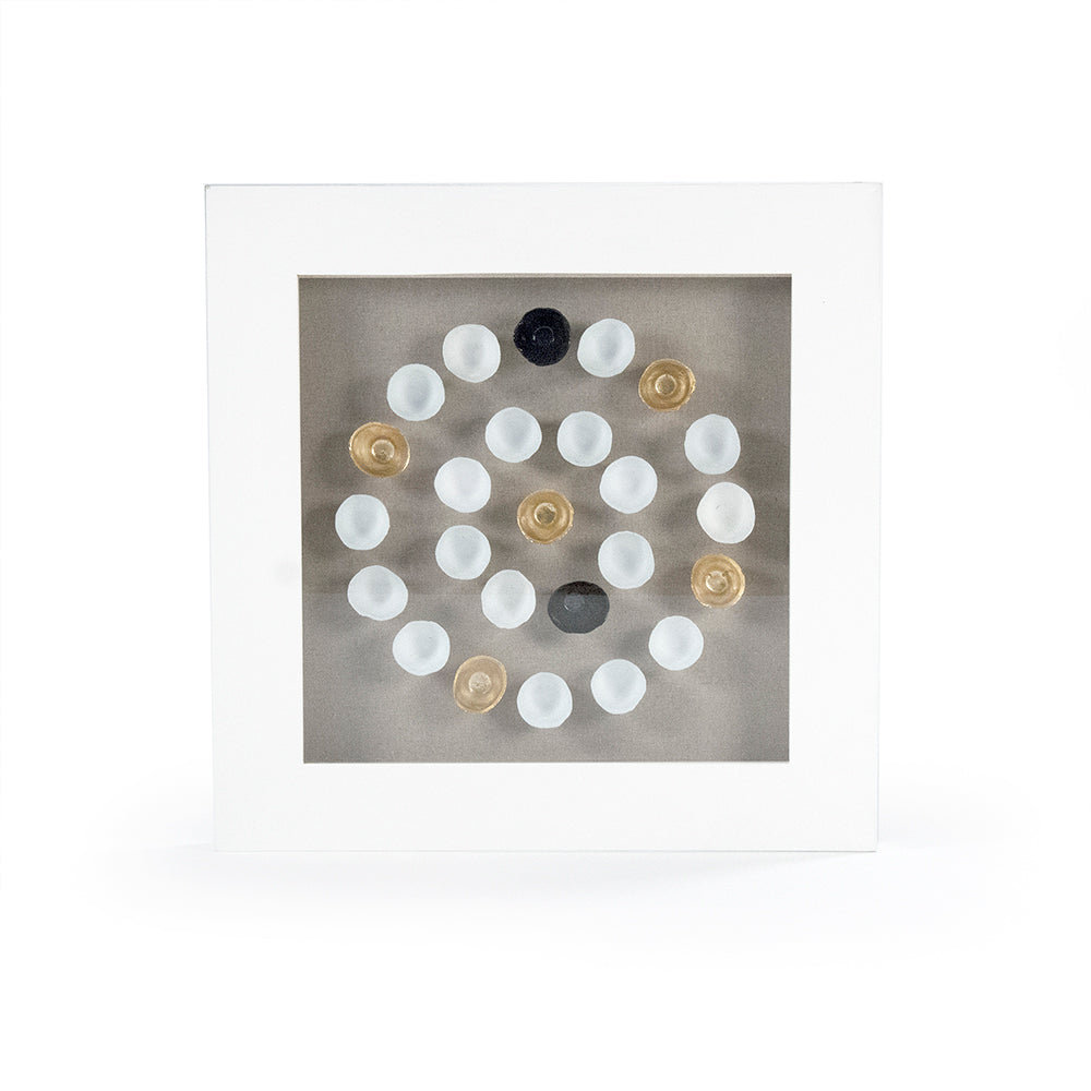 The artwork features a series of circular shapes arranged in a pattern, likely made from pottery materials. The circles are placed against a neutral background, with a glass surface protecting the art within the frame. The circles are predominantly white, with a few gold and black accents, creating a subtle yet sophisticated contrast.
