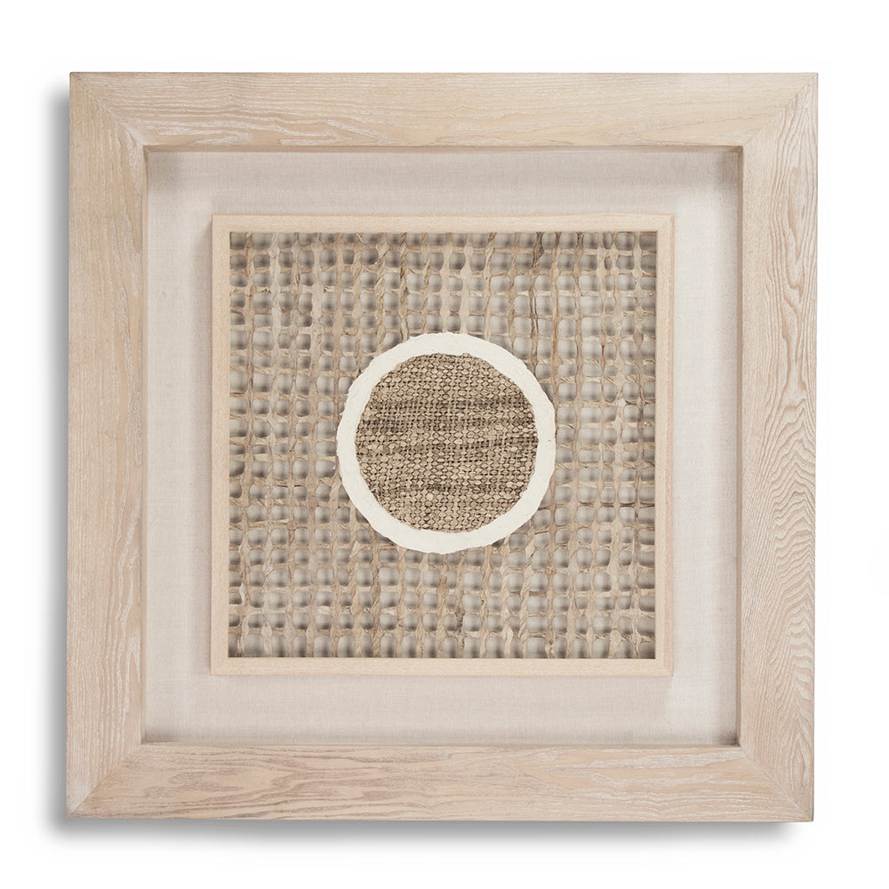 Expanding to a bold 39.375-inch square, this composition moves into investment-piece territory through sheer presence and material precision. The frame upgrades to medium-density fiberboard—a more substantial structural choice than fir wood—supporting the larger format. Handmade paper art, glass, linen, and velvet remain, creating the same layered sophistication. At 2 inches deep and the weight implied by its construction, this is serious wall architecture.