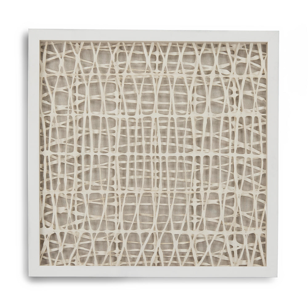 Another square composition in the 24-inch format—each distinct in its handmade paper art expression, unified in dimensional confidence and material precision. The fir wood, linen, velvet, and glass assembly remains consistent, promising durability and a sophisticated presence. At 42 pounds, it carries genuine substance, anchoring walls with the weight of considered craft.