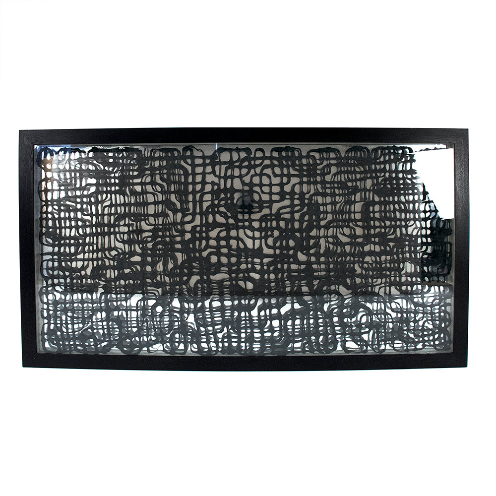 This framed abstract composition presents handmade paper art within a fir wood frame measuring 59 inches wide and 35.5 inches tall—a substantial statement piece for commanding walls. The artistry lies in the crafted paper elements, layered to create visual depth beneath protective glass. At just 2 inches deep, it projects minimal but intentional presence, allowing the composition itself to become the focus without architectural intrusion.