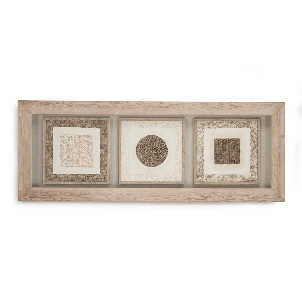 Scaling to horizontal proportions—63 inches wide and 23.625 inches tall—this panoramic composition alters spatial perception through its extended width. MDF framing accommodates the broad expanse, while handmade paper art, glass, linen, and velvet create the consistent layered sophistication. At 2 inches deep and the implied weight of its dimensions, this work functions as visual architecture, reshaping how light and space interact with walls.