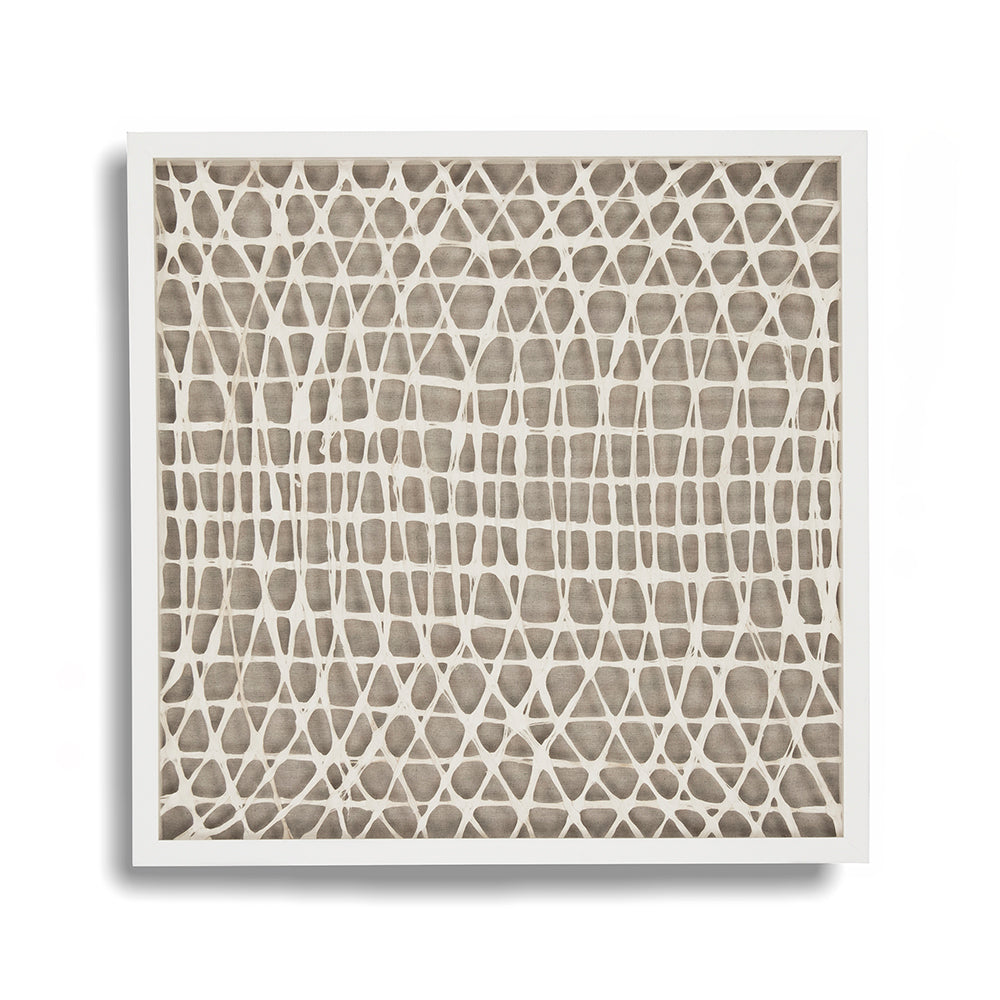 Returning to the 30-inch square format, this iteration of handmade paper art on fir wood with glass, linen, and velvet accents maintains consistent quality across a slightly larger footprint than the 24-inch versions. At 62 pounds and 1.75 inches deep, it carries added substance while preserving the refined profile. The $540 price reflects the scaled dimensions without proportional cost increases—smart economics for building larger wall arrangements.