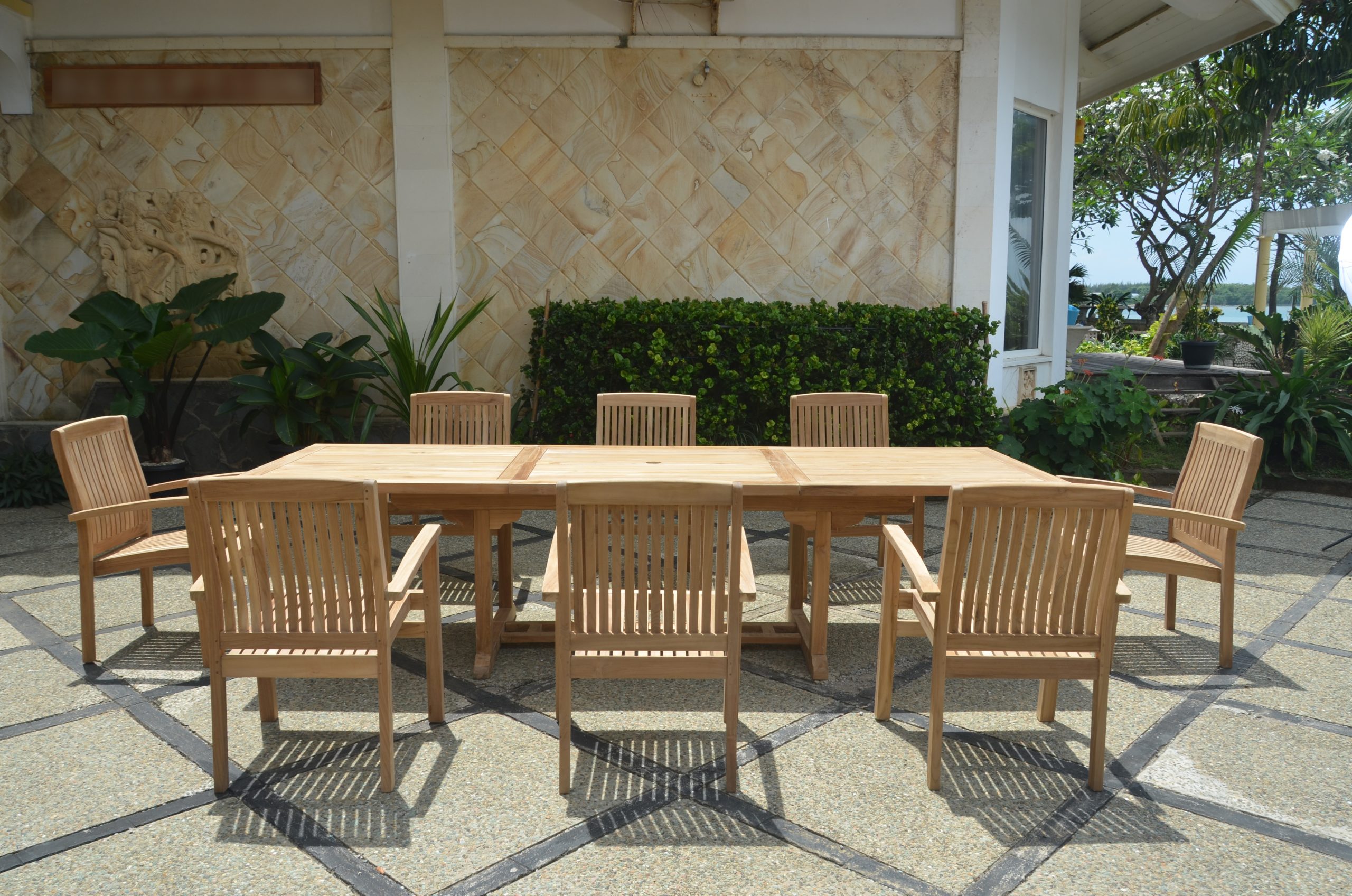 The Bahama Rectangular Extension Table makes the perfect addition to your patio or backyard. The unique built-in butterfly pop-up leaf enables you to open and close your table in less than 15 seconds. The leaf folds away for easy storage. This table stands 29″ high and is 35″ width by 71″ long and if fully extended can reach an opening of 94″ long. The table can be extended with 1 leaf, and seats 8 to 10 people comfortably. The table has the umbrella hole in the center when the leaf opens with brass plug when not in use. This table arrives with eight Sahara Stacking Armchair in traditional curved back style and contoured seats for a comfortable dining experience. The style will never go out, but quietly blends with any other design. Built with extra thick Grade-A premium teak thats unfinished, it is guaranteed to last outdoors for generations. It comes in knocked down, with easy assembly.
