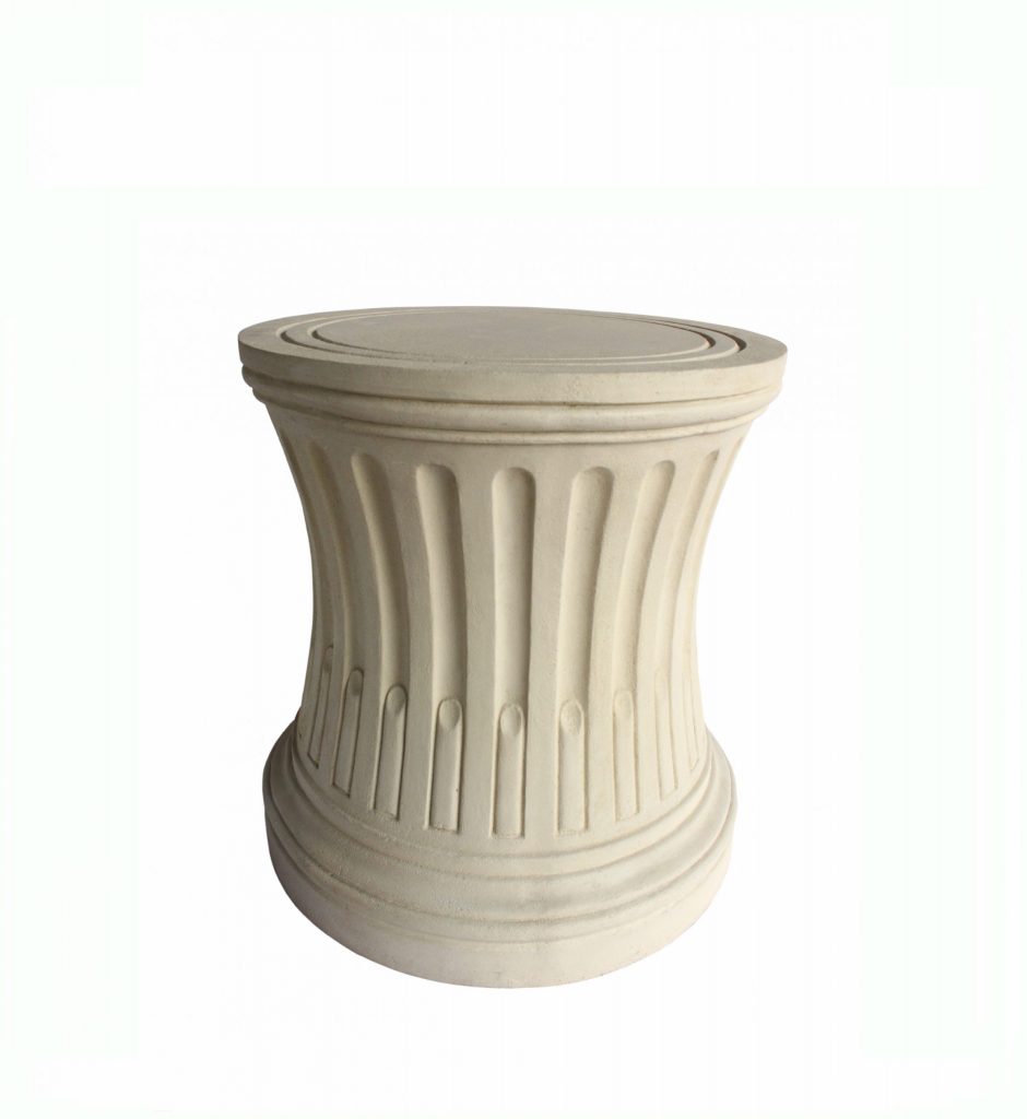 Limestone pedestal elevates tabletops with classical restraint.
