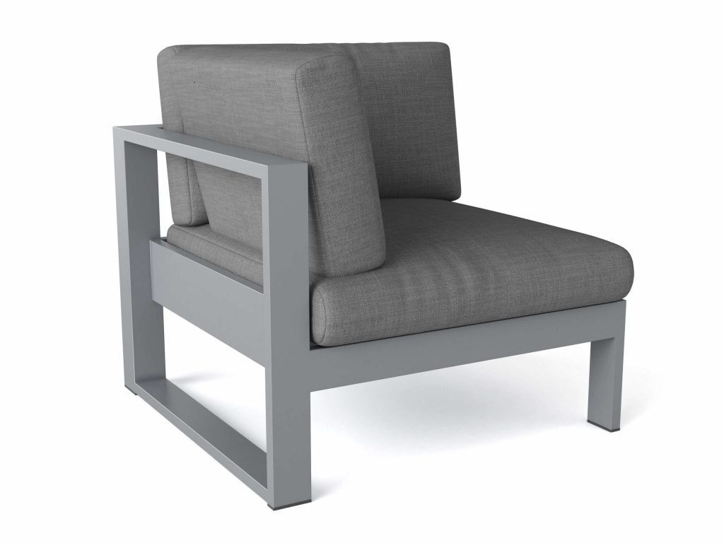 Give your backyard a modern contemporary look with the Luca Deep Seating Corner Chair. Sleek, modern, and machine crafted for quality and substance, it features a 2mm thick Aluminum Frame finished with power coating. As the corner piece of the Lucca Deep Seating Set, be sure to add and mix and match other pieces from the collection such as the center chair, the right and left loveseat, the Lucca Armchair, Side table, Coffee table, and Ottoman to create your custom Lucca Deep Seating Set. Features Non-Marking Black Plastic Foot Caps. Cushion pattern and color choice included. Be sure to contact your representative.