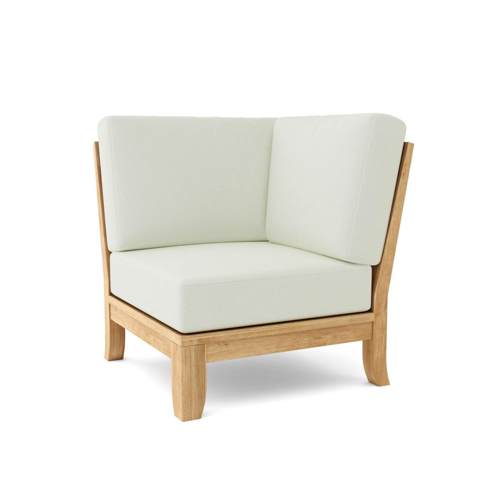 The Riviera Luxe Corner Modular exhibits classic design with deep seating comfort in the luxury of the outdoors. As the corner piece of the set, add the Center Modular Chair, Left Modular Chair, Right Modular chair, Ottoman footrest, a coffee table, and a side table from the Riviera Luxe Modular Collection for a complete deep seating set. Includes Sunbrella All-Weather cushions 27” deep and 6” thick from a variety of fabric pattern and color options. Built from genuine Grade-A Teak sanded smooth without finish, it is the perfect chair for your outdoor needs.