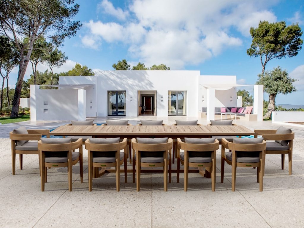 A luxurious dining set that seats up to twelve, host large outdoor dinners with family and friends in the comfort of your home with the Coronado Extension Table and Dining Armchair Set. Made from genuine grade solid teak wood, this set features the Coronado Extension Table, measuring up to 88 inches in length or 136 inches when fully extended. The built-in butterfly pop-up leaf enables you to open or close your table in less than 15 seconds, and the table can be extended with 1 or 2 leaves depending on the size needed. Also arrives with 12 Coronado Dining Armchairs which includes comfortable cushions and pillow from All-Weather Sunbrella fabrics, with your color choice. Expertly crafted and shaped to exquisite design, this round curved dining set features exceptional design and premium quality.
