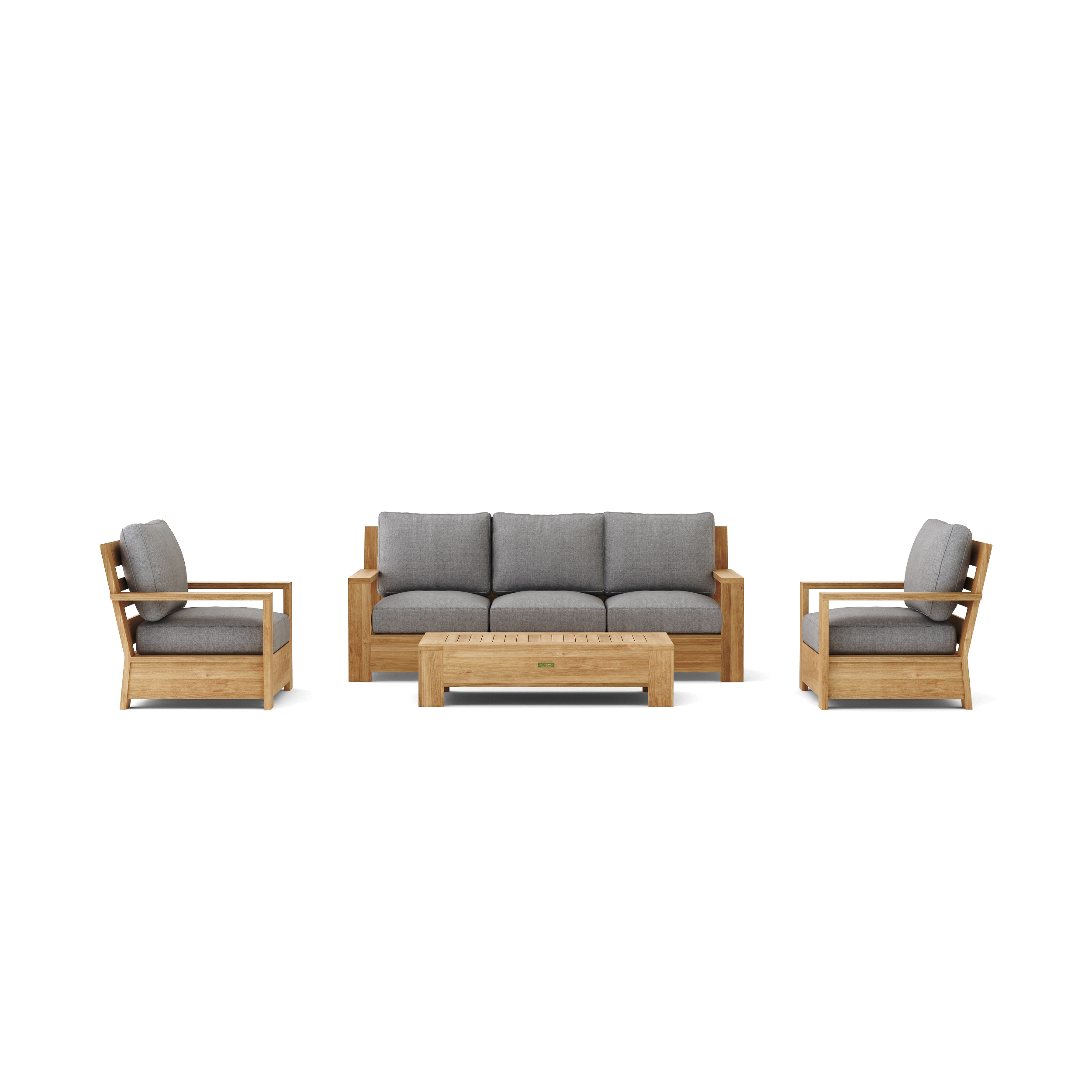 An artistic mix of modern and classical design, this Madera Deep Seating Set is sure to make any setting or decor pop with its unique style and design elements. A platform deep seater that’s sturdy, solid all around, and crafted from premium teak solid wood, it’s treated unfinished and sanded smooth for a natural touch. Ergonomically comfortable and aesthetically pleasing, careful attention was made on the angle of the seats back for optimal lumbar comfort and support while maintaining artistic elements on its slats pattern design. Includes 6” thick cushions from All-Weather Sunbrella Fabrics with color and pattern options.