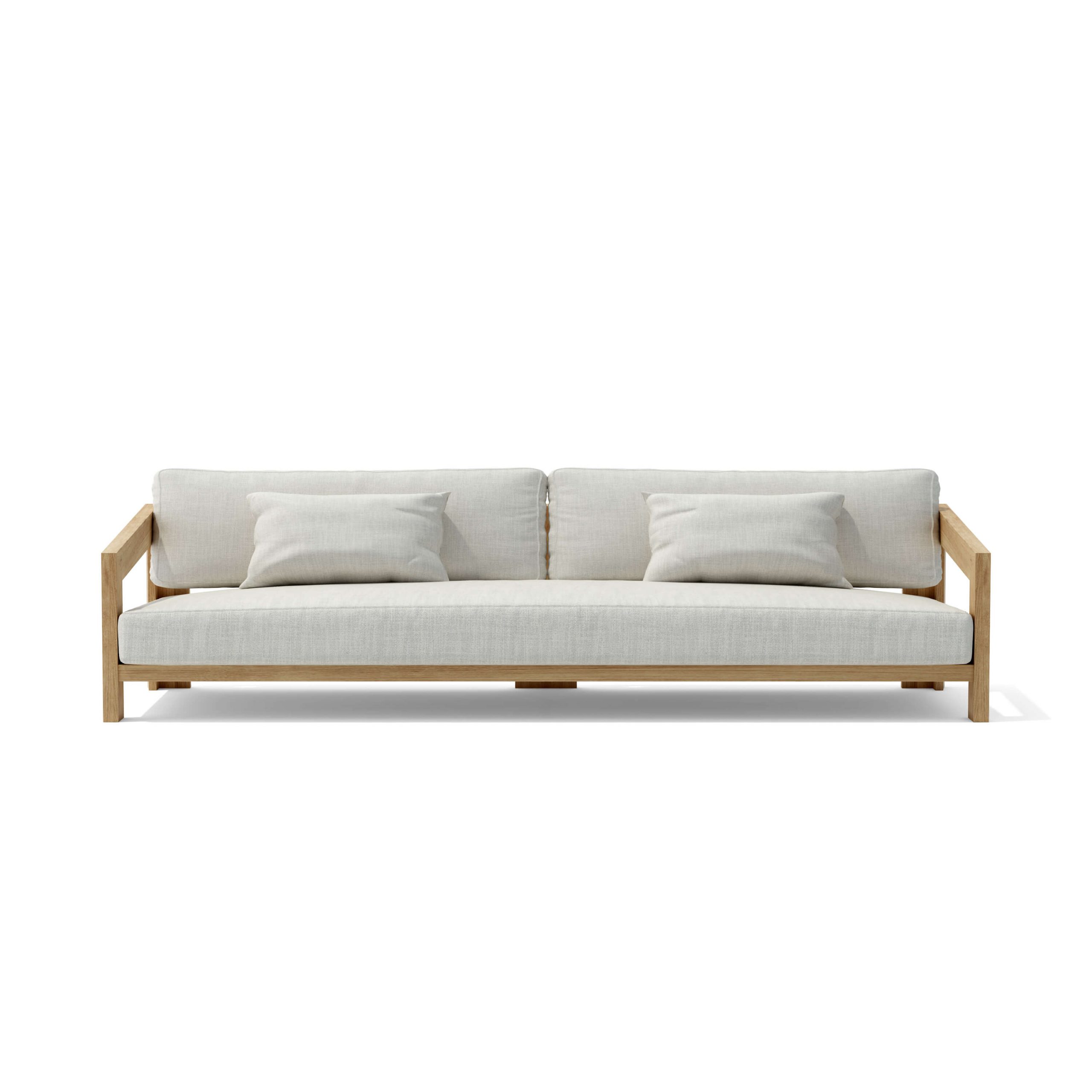 Featuring bold lines and a striking presence this Smyrna 4-Seat Sofa is a well-constructed and fully built deep seating sofa measuring 8 ½ feet in length. Made of premium unfinished teak it includes 5 ½” thick cushions from All-Weather Sunbrella Fabrics with pillows to match. Perfect for the home and outdoors take a seat in luxurious comfort in the company of family and friends as this 4-Seat Sofa indulges you in. As part of the Smyrna Collection be sure to add the Smyrna Lounge Armchair, Coffee Table, Sun Lounger, Dining Table and Dining Armchair for the complete collection.