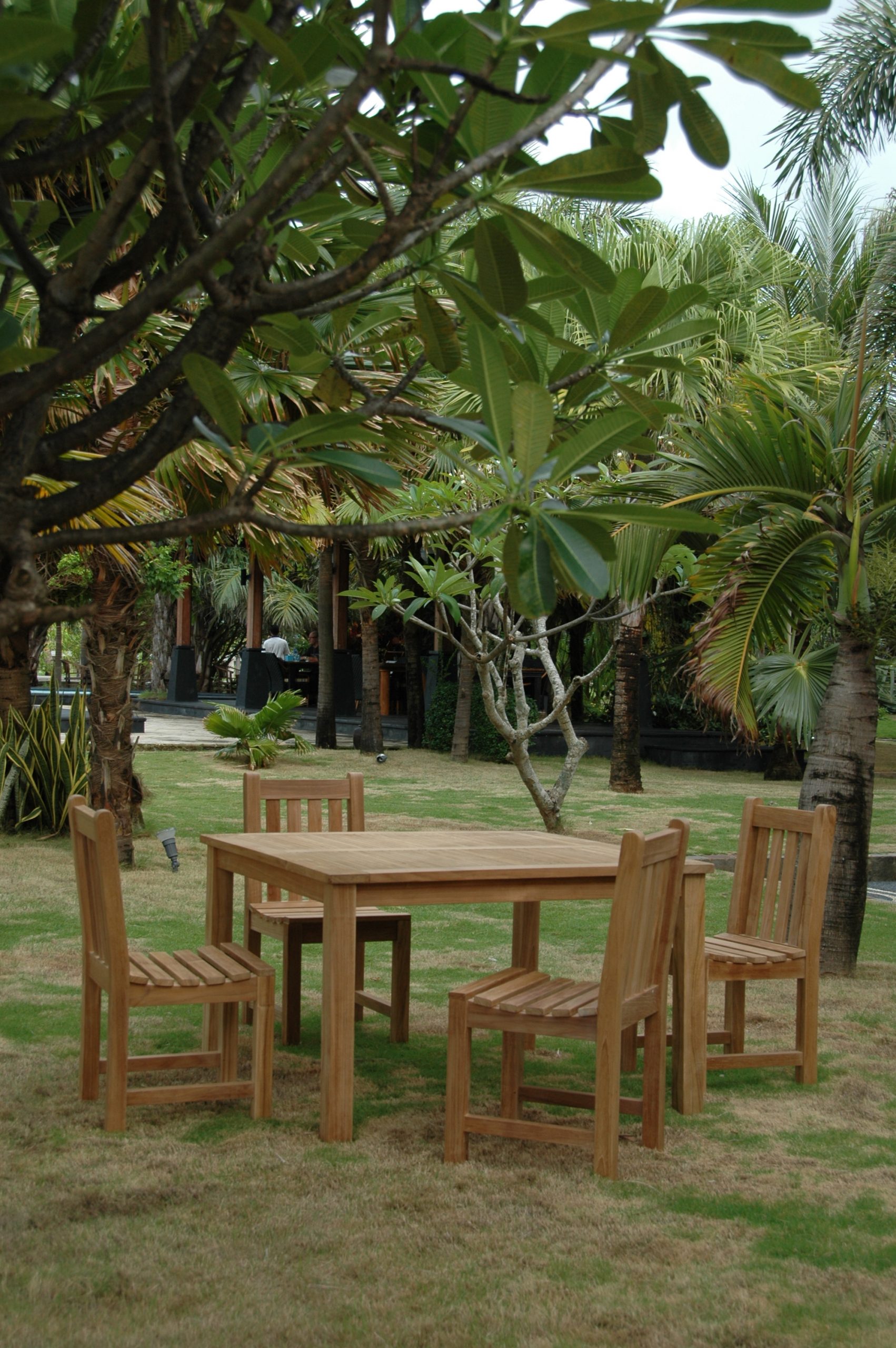 A spacious and durable teak outdoor dining set for the patio or yard, this set includes a Windsor 47” Square Table with four Classic Dining Chairs. Made of solid teak wood sanded smooth without finish, the Windsor 47” Square Dining Table is a bulky and quality sized table that’s durable and stable; while the Classic Dining Chair features curved and countered seating for a comfortable seating experience. The perfect table set for outdoor dining, guests will be amazed by its quality built frame and size as well as the smoothness and touch of the authentic teak wood. Table includes an umbrella hole with brass plug when not in use.