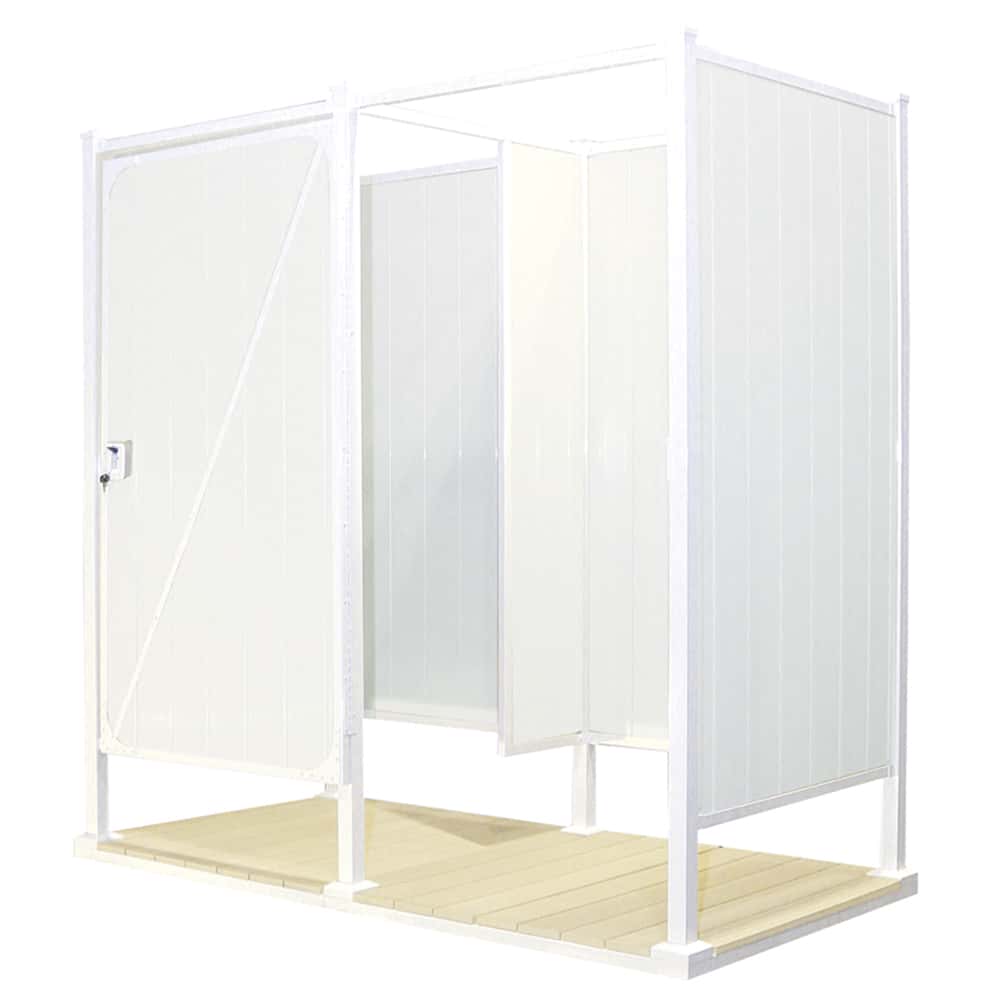 - Configuration: Four-sided design provides maximum weather protection with compartmentalized shower/changing layout.