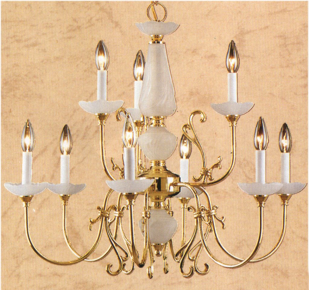 The Bloomington series has a traditional look with simple, bent tubing arms complemented with cast scroll work and frosted glass column accents and bobeches.
