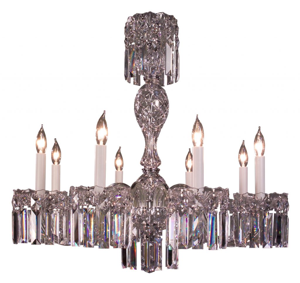 The Buckingham series has the clean lines and elegant form to complement any upscale décor. All of the frame components, column vases, balls, arms, and bobeches are lead crystal. The hand cut crystal column parts are perfectly complemented by the square and rectangle crystals, breaking light into the full spectrum of colors. Imagine the elegance of these fixtures positioned over place settings of fine Baccarat or Waterford crystal stemware.