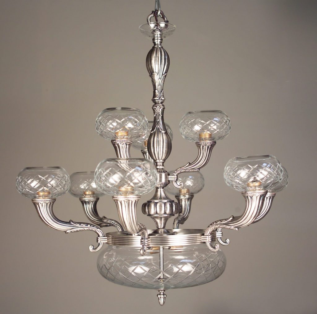 The Chatham series has a very traditional but clean look. it is made of solid cast brass and has a high quality finish. Roman Bronze made by oxidizing the brass to a naturally aged bronze (brown) finish then it is hand brushed to bring out the underlying brass in soft highlights that accentuate the casting details. The BBK-Bronze with black patina is made by lightly polishing the brass then antiquing it with a black lacquer that holds in the crevasses to bring out the casting details. The Millennium Silver is made by plating the brass first with a silver nickel, then plating with a blued nickel then brushing the final plating to bring out the silver highlights. The crystal clear cut lead crystal bowls complete the high quality traditional look of the Chatham series fixtures.