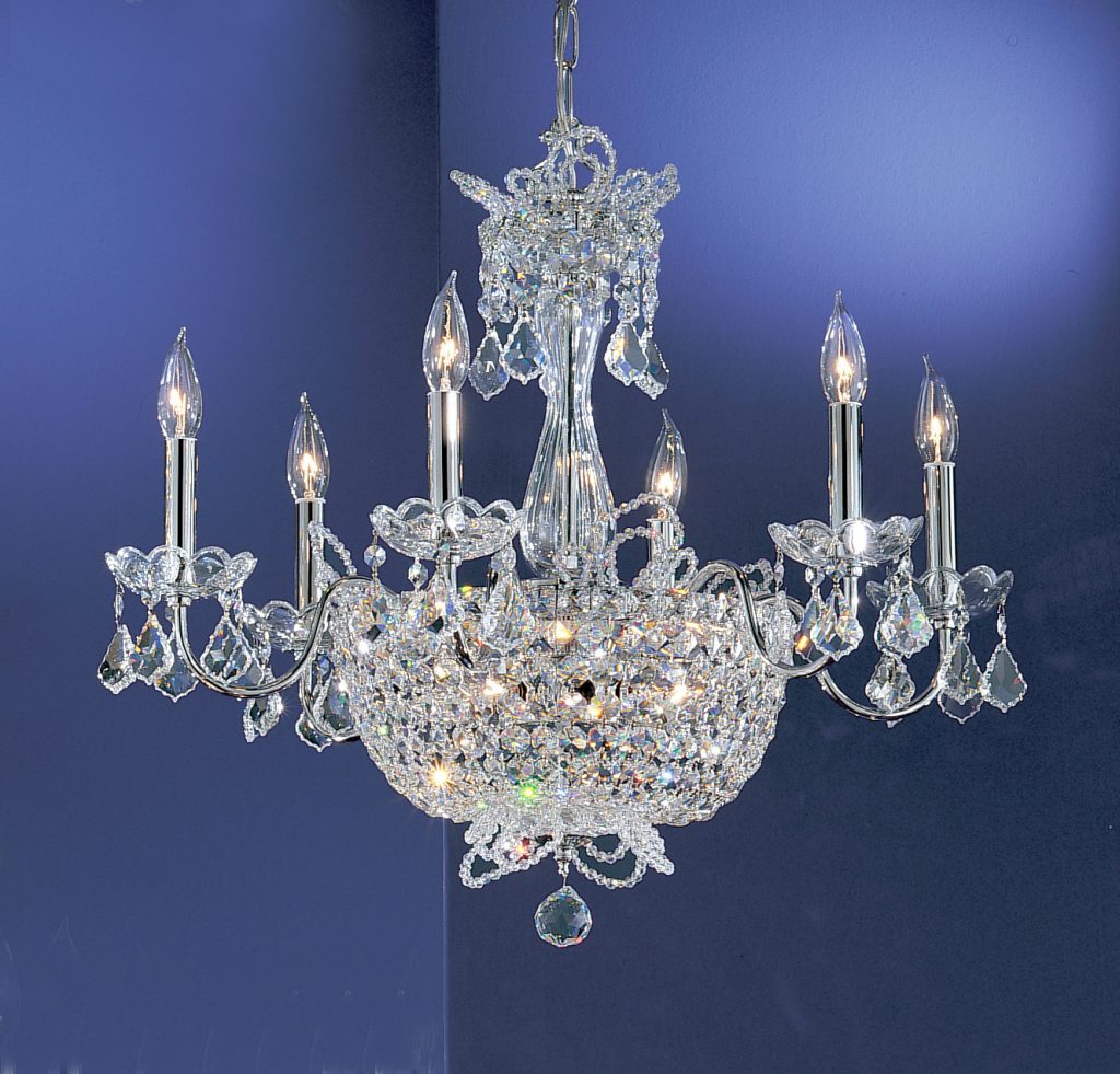 Lighting designed for your personal castle. This series is offered in either chrome for brilliance or gold for warmth. The high-quality metalwork combined with European made lead crystal column parts and lavishly decorated with the highest quality crystal graduated chains and prisms make these fixtures fit for a king. The removable lead crystal Tiara ornamentation sparkles like diamonds