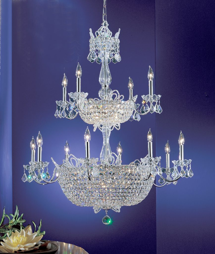 Lighting designed for your personal castle. This series is offered in either chrome for brilliance or gold for warmth. The high-quality metalwork combined with European made lead crystal column parts and lavishly decorated with the highest quality crystal graduated chains and prisms make these fixtures fit for a king. The removable lead crystal Tiara ornamentation sparkles like diamonds