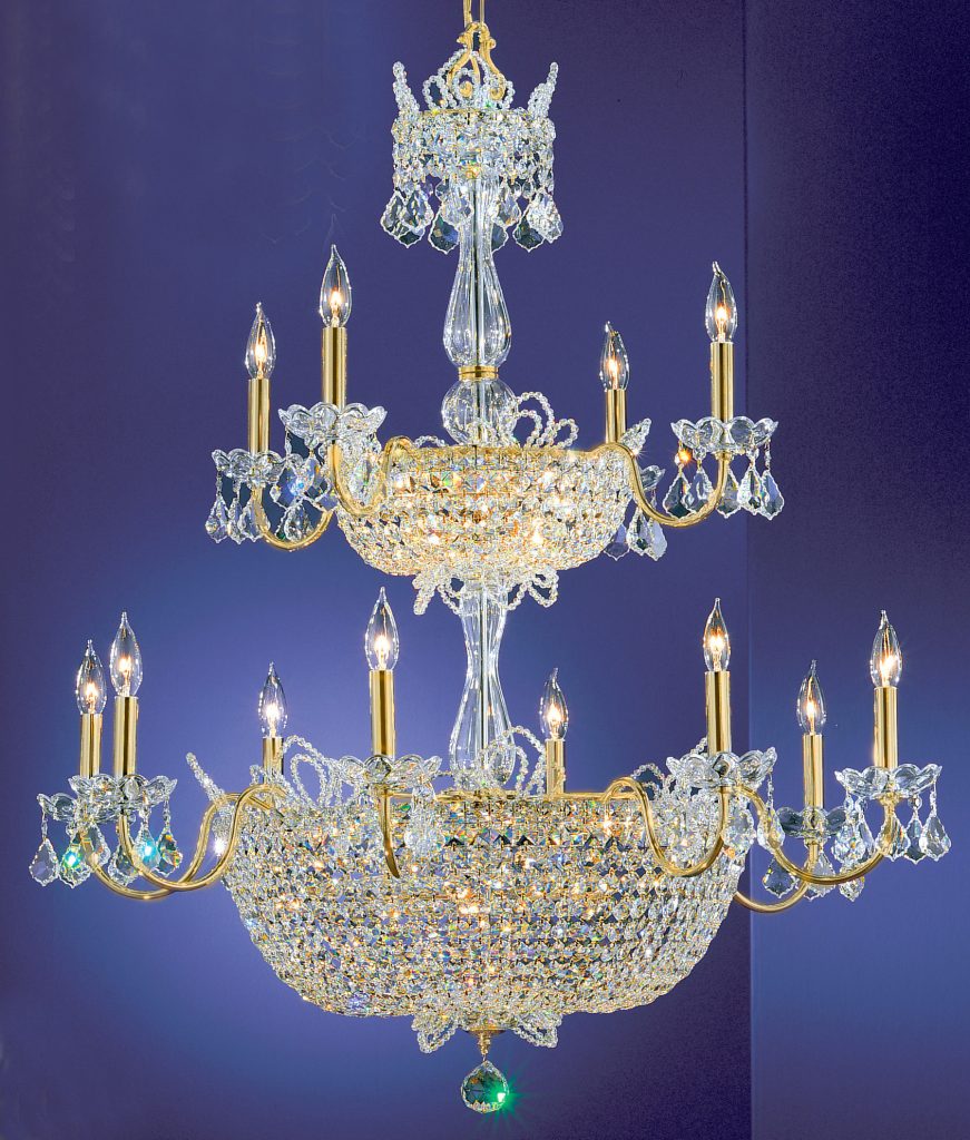 Lighting designed for your personal castle. This series is offered in either chrome for brilliance or gold for warmth. The high-quality metalwork combined with European made lead crystal column parts and lavishly decorated with the highest quality crystal graduated chains and prisms make these fixtures fit for a king. The removable lead crystal Tiara ornamentation sparkles like diamonds