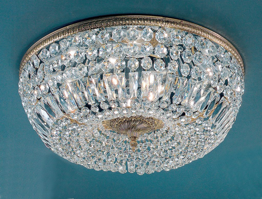 Engraved brass galleries lightly antiqued in French gold with chrome reflectors and draped with attractive Italian graduated crystal chains. For better definition and sharper cuts of crystal, our Crystalique crystal is available