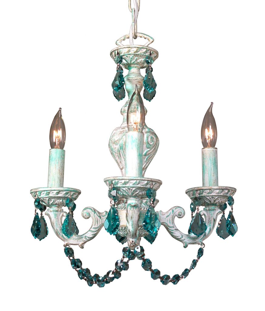 A whimsical union of traditional cast mini chandeliers with colorful crystal accents to grace any part of the home. Let your decorating inspiration guide you – either in powder rooms, baths, girls rooms or anywhere else. Crystal pendants are French Pendalogs.