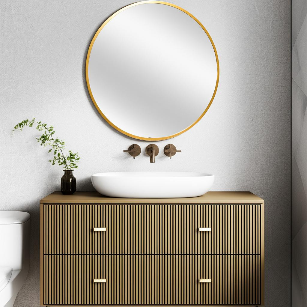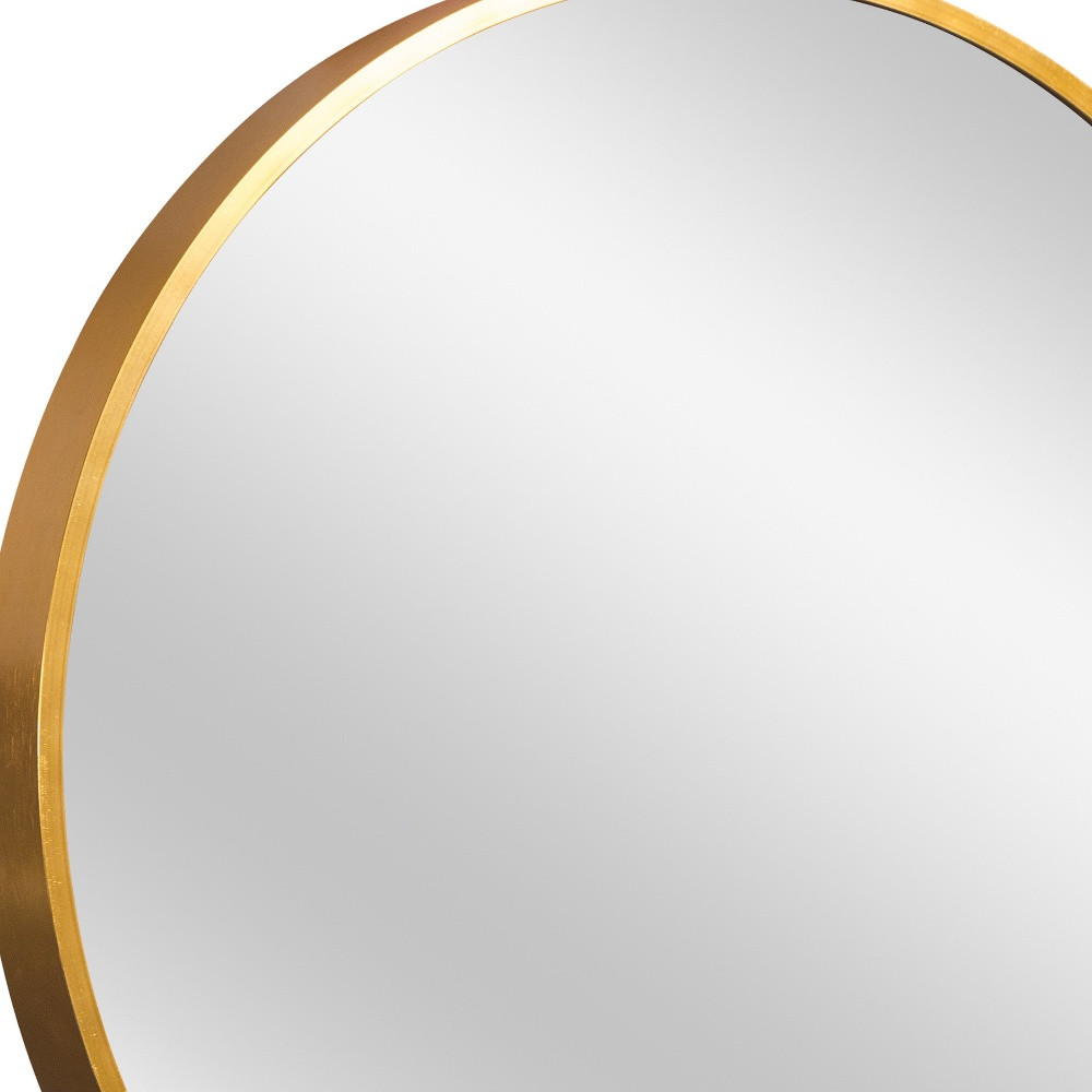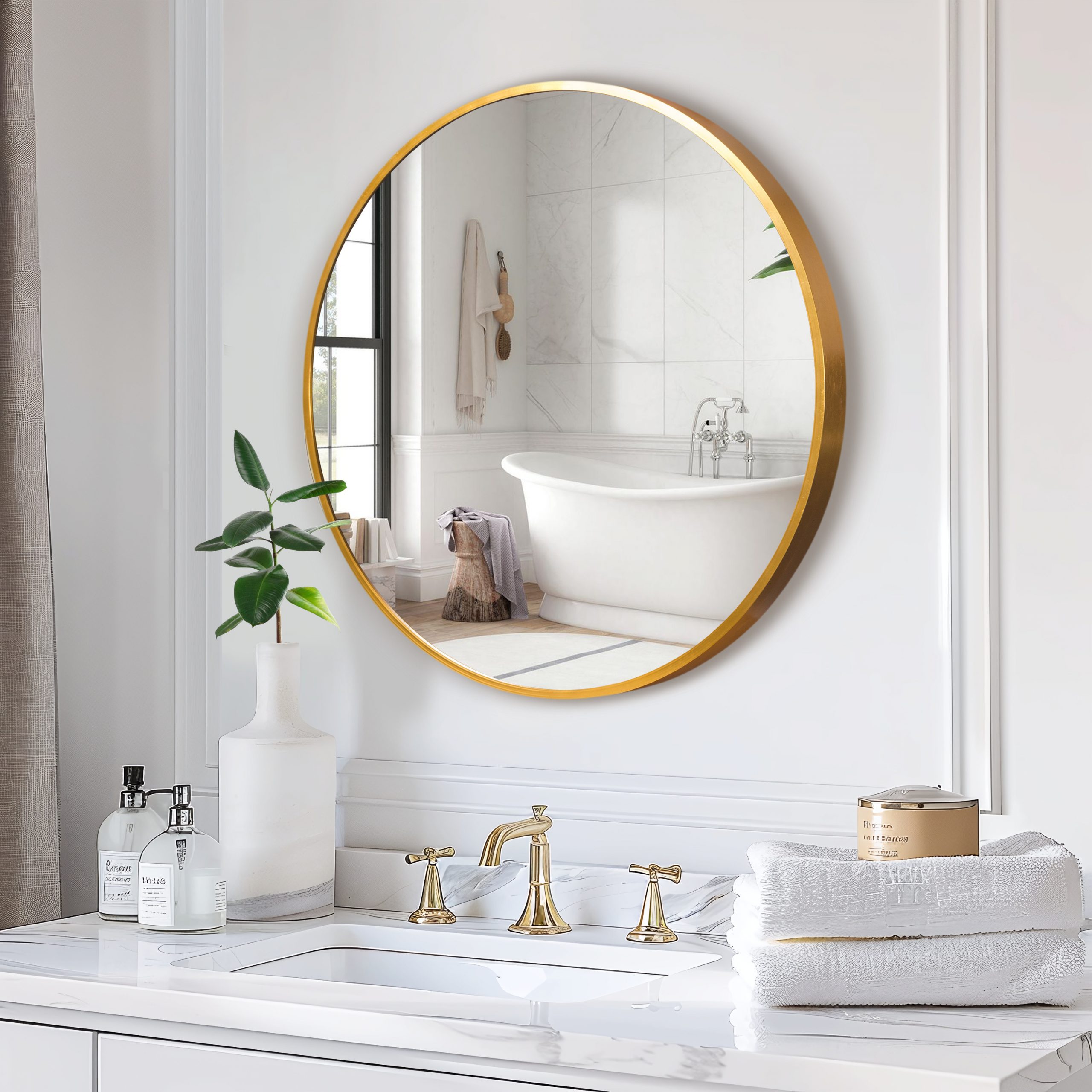 The perfect way to add some brightness and utility into your bathroom, this 20-inch gold round aluminum framed bathroom vanity mirror will be a great addition to any bathroom. The round shaped mirror adds a nice touch of depth and texture and also makes it very practical. This mirror makes your bathroom glow with its fantastic frame. The mirror of contemporary style can also decorate your room and bring brightness to your living space. Due to its high quality construction, it will last a lifetime. Use it in the bathroom as a vanity mirror, in the bedroom for last checks as you head out, or anywhere in your home as a decorative mirror to add some brightness around the space. 20-inch H x 20-inch W x 1.1-inch D