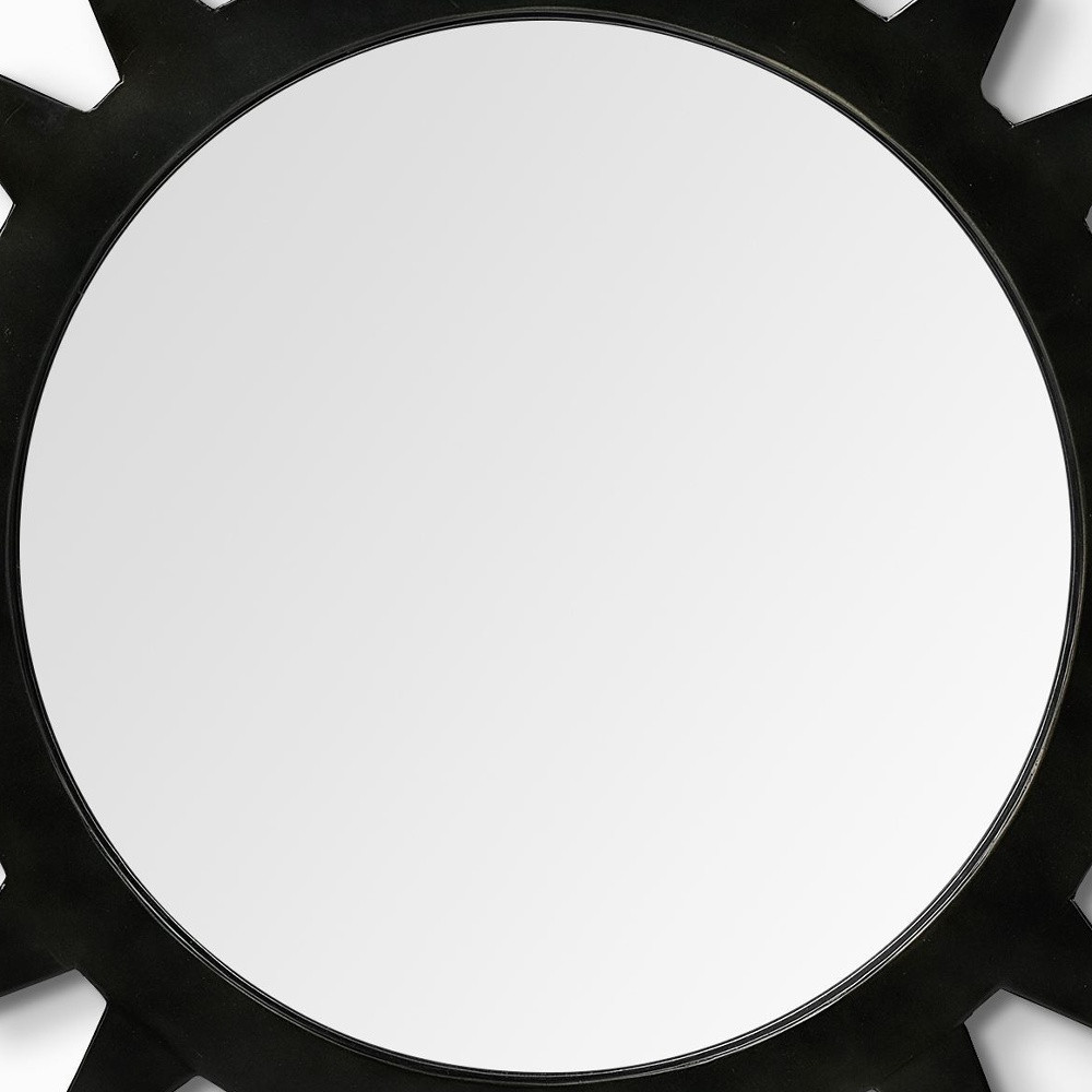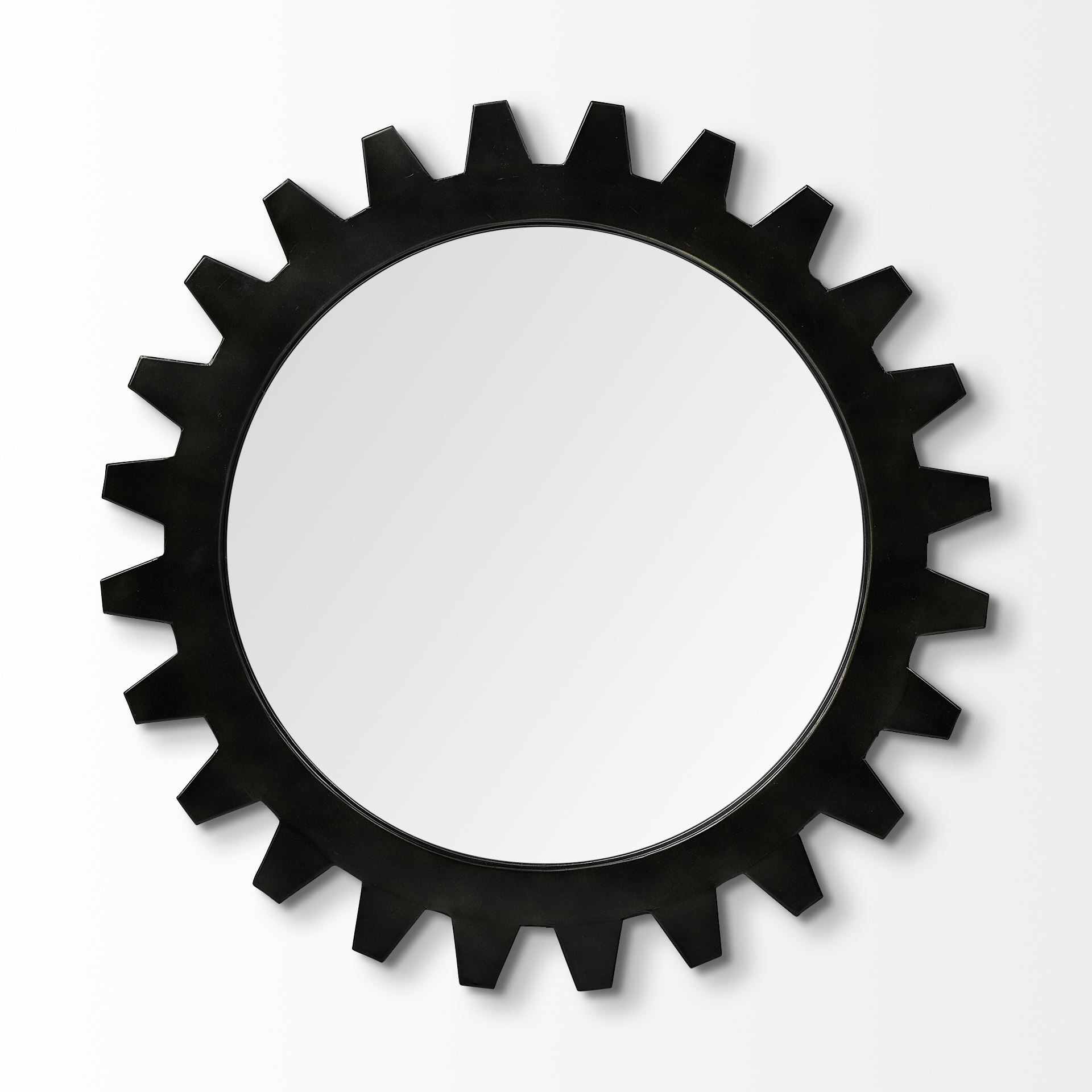 Artisan crafted resembling a cog, this 26″ Black COG Round Metal Frame Wall Mirror will add noticeable variation to your space. Whether used alone or paired with other mirrors, this accent makes a huge difference in your decor. it is held in a dark metal frame; add it to any room and enjoy the exceptional sparkle that ships with it. dimensions: 26″.