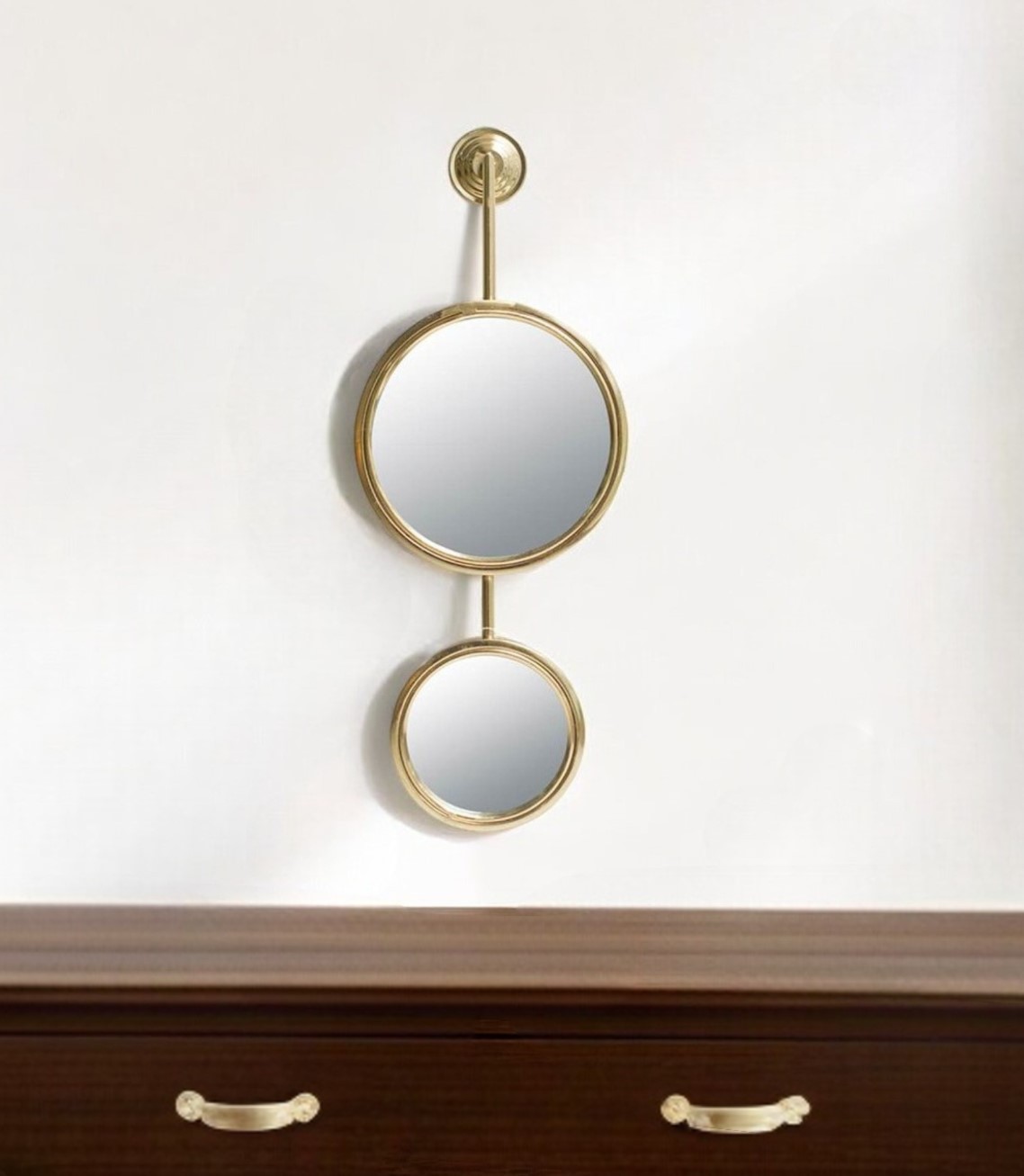 Beautify your space with an ornament that’s original and unique at the same time with this 29-inch gold round iron framed accent mirror. This round shaped mirror will open up any space you put in piece in. This frame works nicely with the full-bodied mirror in the middle. The contemporary style of this piece will work great in any room you choose to put it in. Its style is certain to get rid of that trifling feel of boredom, and the quality of its finish and color will grant your place a flavor of fashion. This mirror can fit perfectly in any space and give that space a distinctive look. 28.5-inch H x 11-inch W x 2.2-inch D