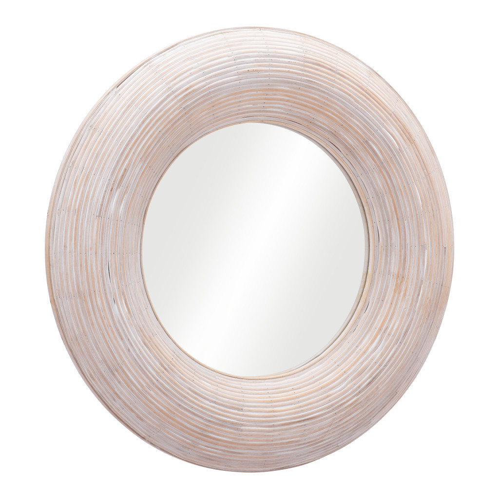 Beautify your space with an ornament that’s original and unique at the same time with this 32-inch beige round framed accent mirror. Inside the frame there is a round shaped mirror which will open up any space you hang this piece in. This frame works nicely with the full-bodied mirror in the middle. Its modern style making this the perfect versatile accent piece for most any decor. It is the perfect wall decor to keep up all year round. This unique mirror will look great as part of your existing decor or you can use it as a statement piece anywhere in your home. 31.5-inch H x 31.5-inch W x 2.6-inch D