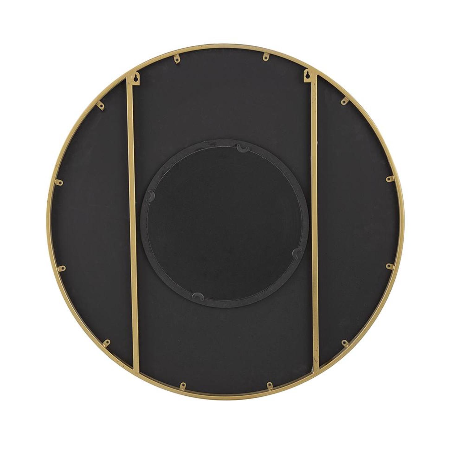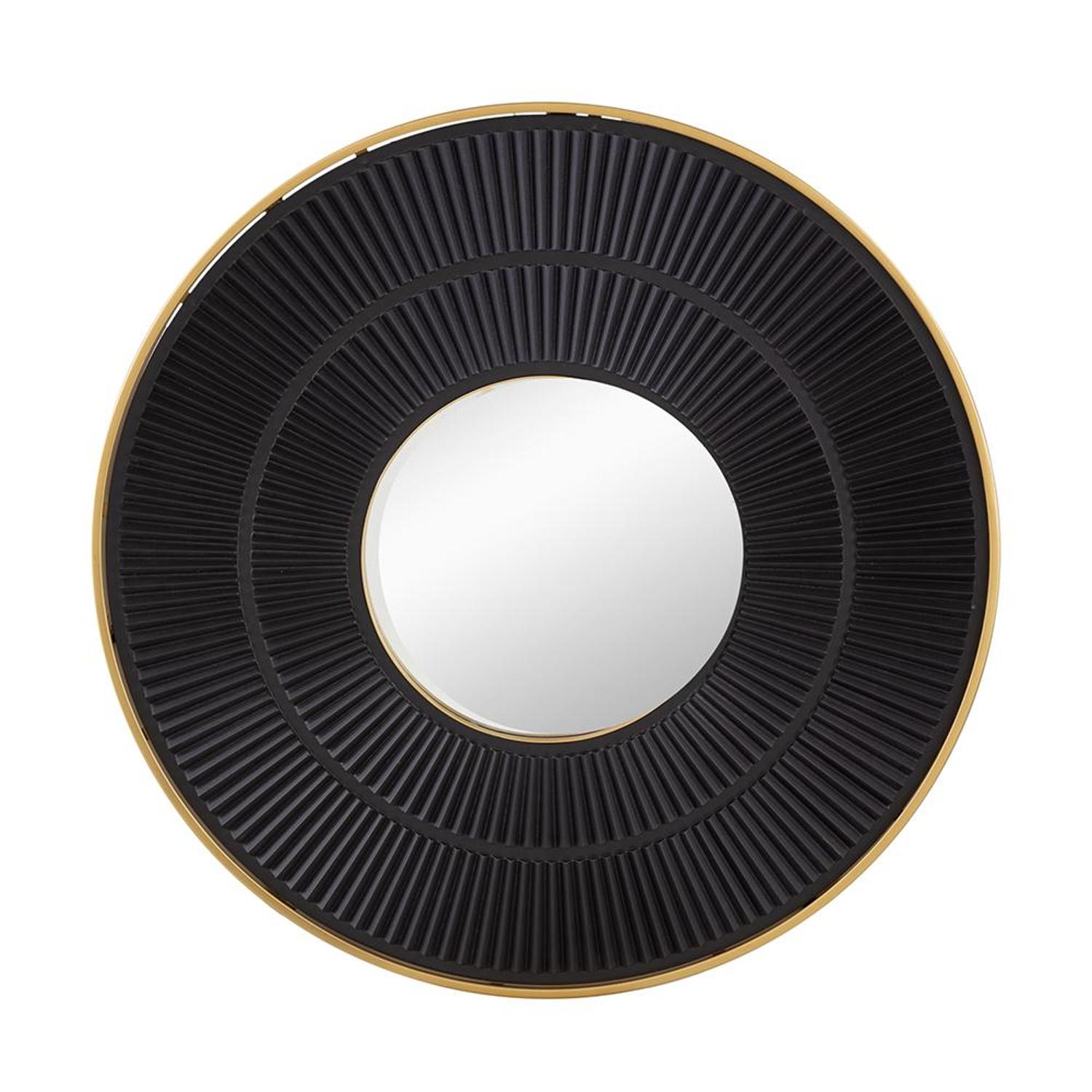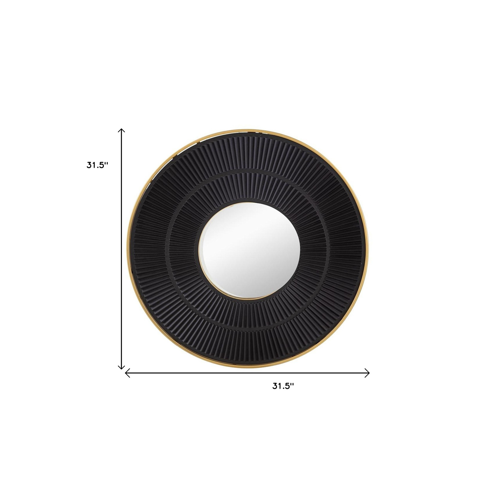 Beautify your space with this 32-inch black and gold round wood and metal framed accent mirror. Framed with manufactured wood and metal, this mirror will bring practical application and fashionable design to your space, adding some modern flair to your decor. This mirror will be a great useful addition to your home but will also help elevate the space in the room. Add this exceptional quality mirror to your space for a beautiful reflection and a bit of elevated style. 31.5-inch h x 31.5-inch w x 1.2-inch d.