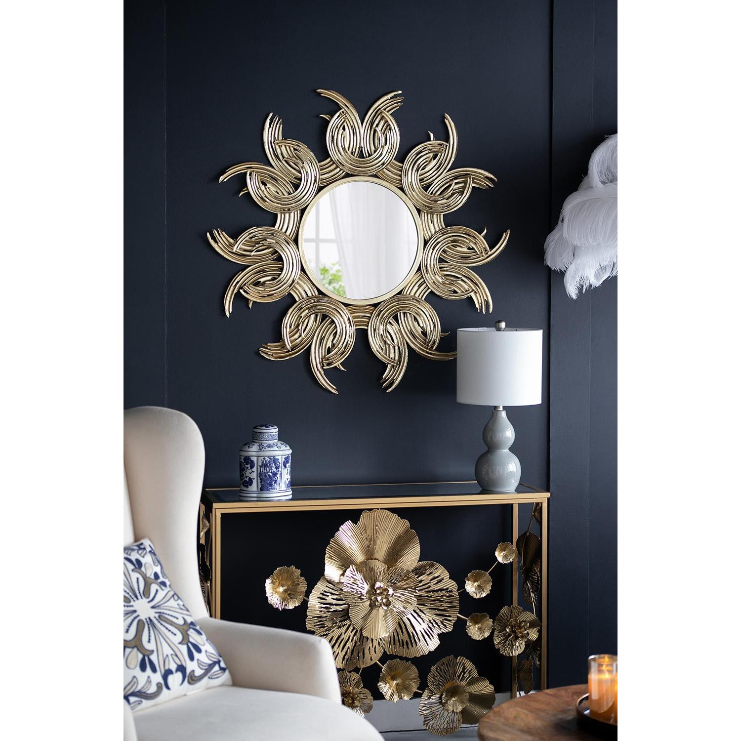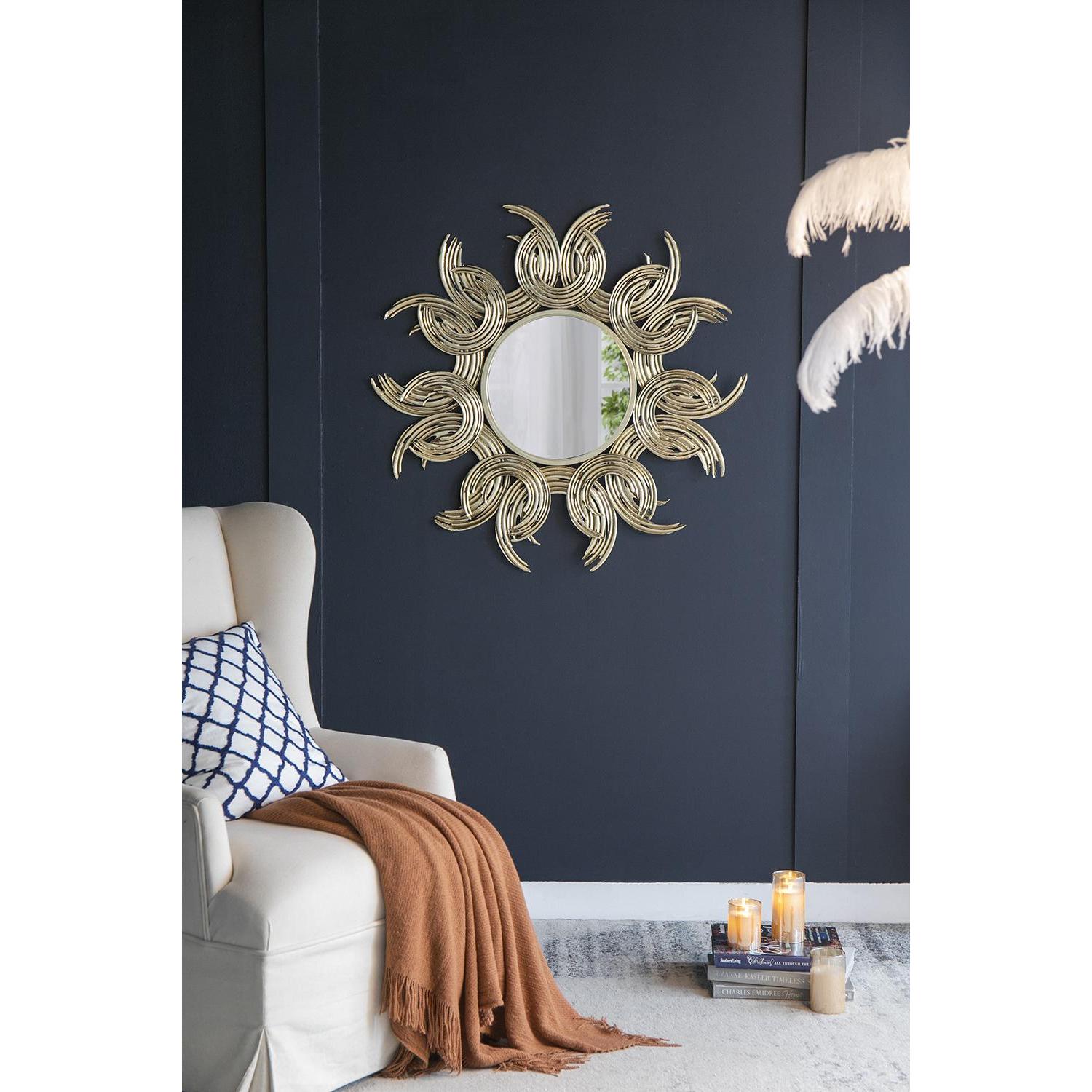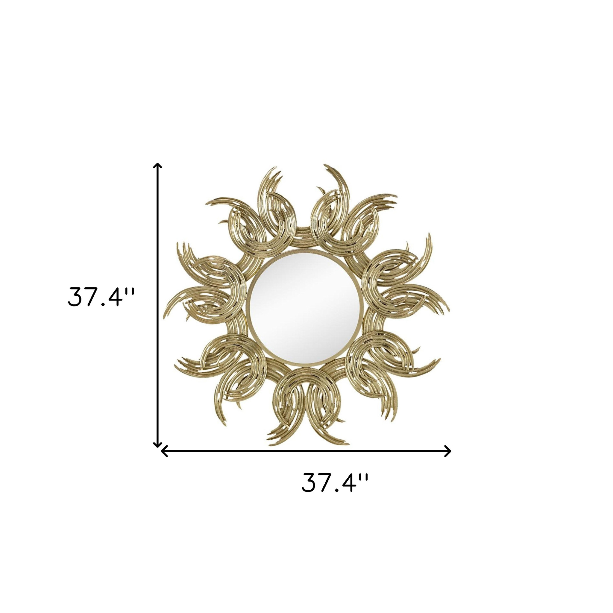 The elegantly crafted 37-inch gold abstract sunburst iron framed accent mirror is what you need to add finishing touch to your decor. The round mirror is framed with a modern and slightly abstract take on a sunburst shape, that will give your space lots of depth and dimension. Generously sized, this piece will make an eye-catching modern and contemporary focal piece in your room. 37.4-inch H x 37.4-inch W x 1.2-inch D