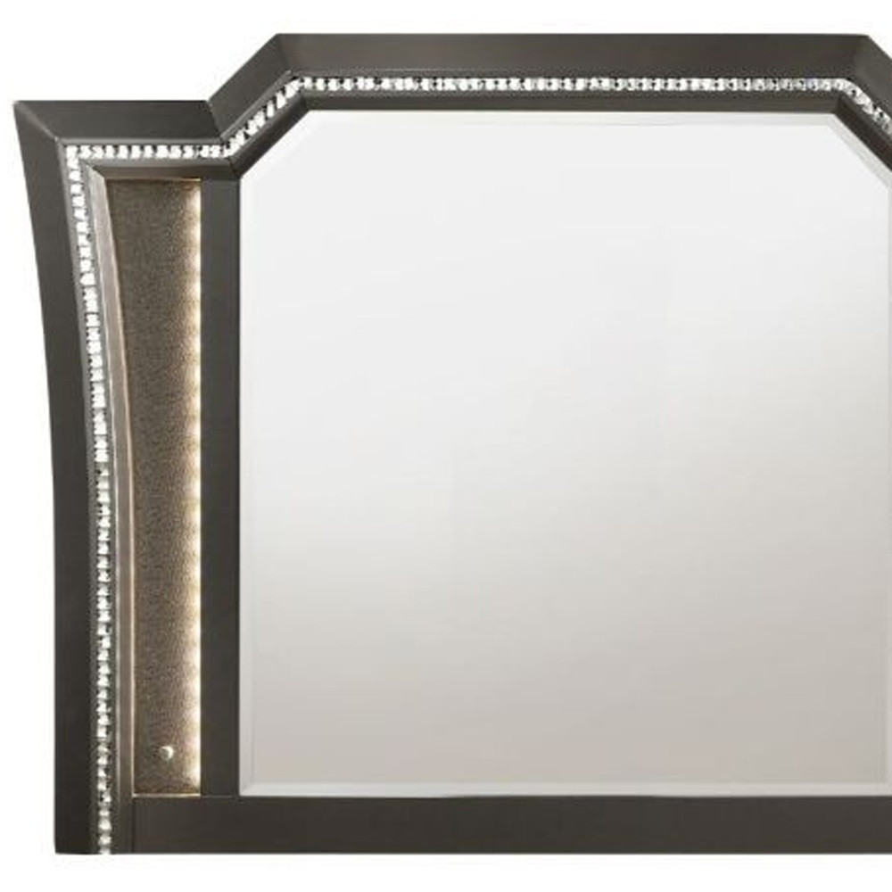 This 38-inch gunmetal lighted abstract wood framed mounted dresser mirror adds the finishing touch to your bedroom. Framed with wood, this mirror will bring practical application and fashionable design to your space, adding some glam flair to your decor. This mirror will be a great useful addition to your home but will also help elevate the space in the room. This mirror is the perfect choice to update your bedroom and create a sanctuary of comfortable and inviting relaxation for your home for years to come. Produced with premium quality glass for a beautiful reflection, this mirror will provide an exceptional visual experience. 38-inch h x 51-inch w x 1-inch d.