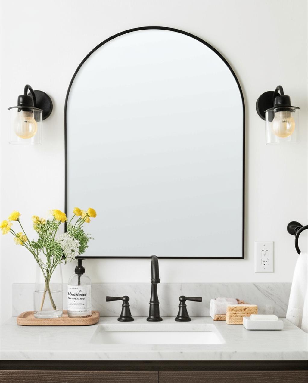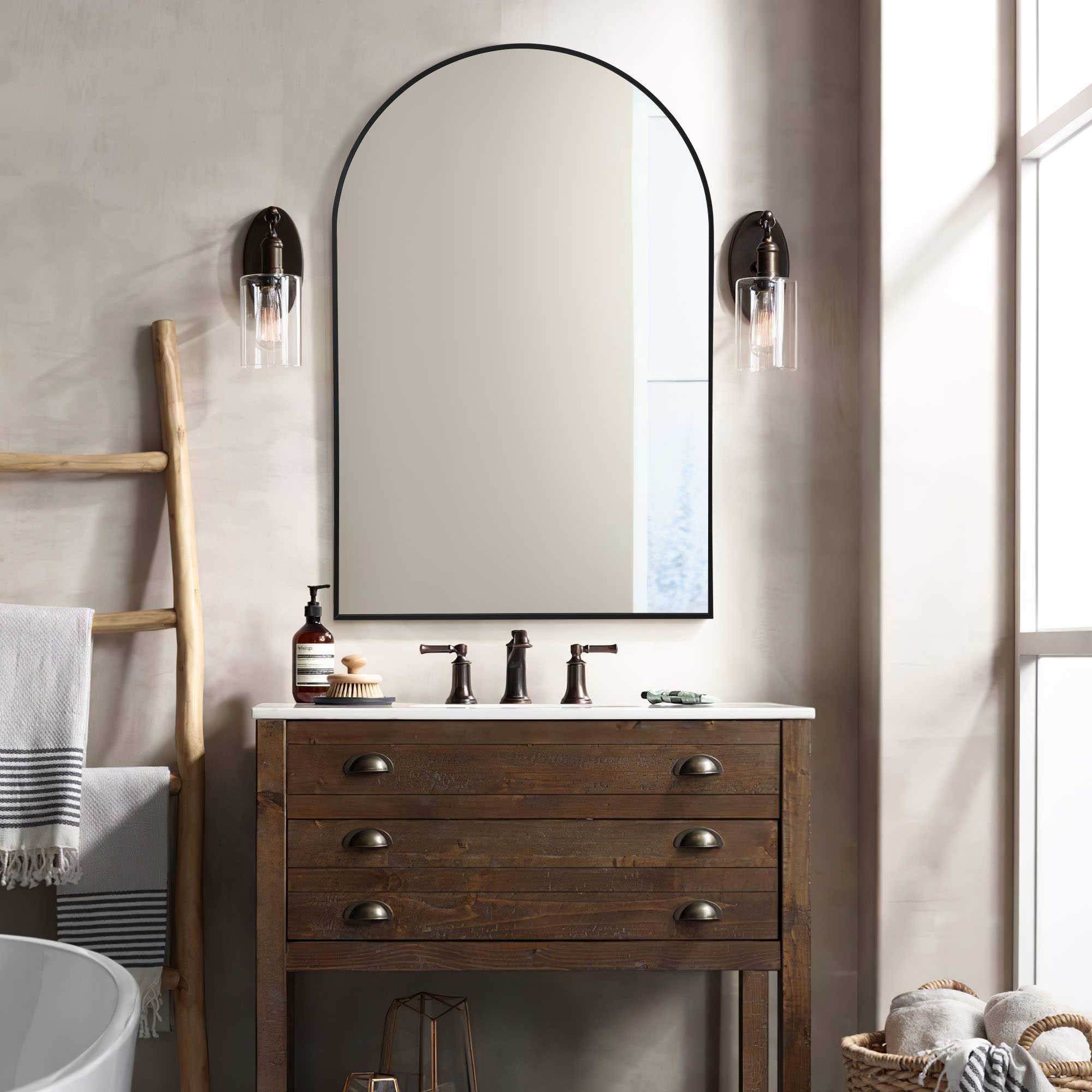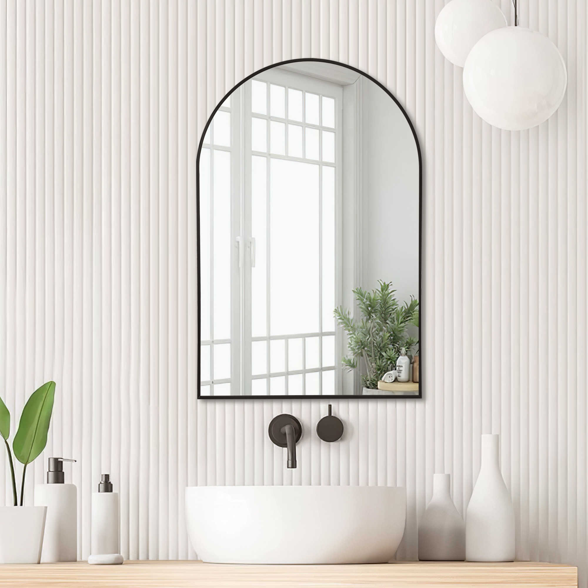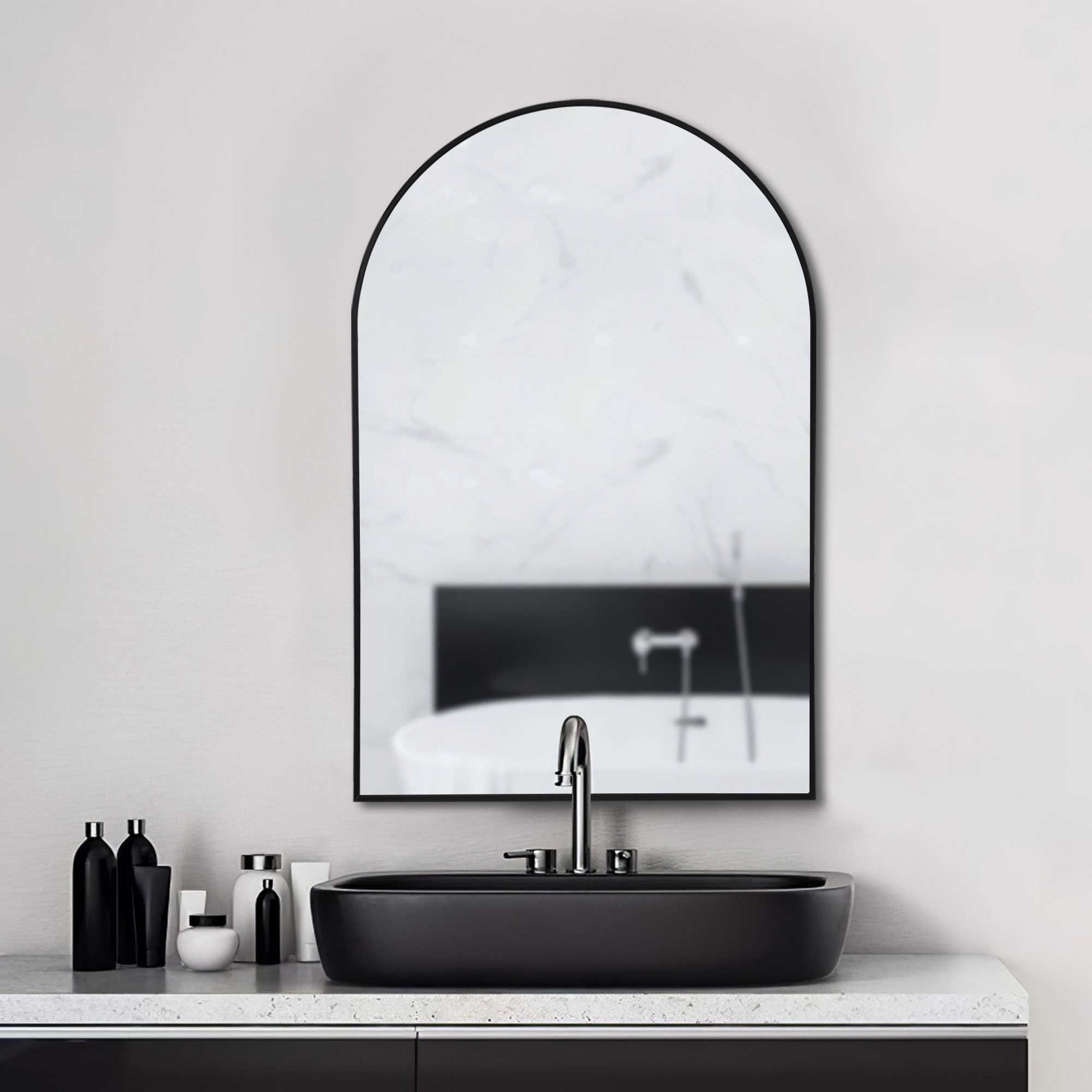 Enhance your bathroom with this 39-inch black arch metal framed bathroom vanity mirror. Framed with metal, this mirror will bring practical application and fashionable design to your space, adding some casual flair to your decor. This mirror will be a great useful addition to your home but will also help elevate the space in the room. Ideal to mount above your bathroom sink or vanity in your bathroom, this versatile piece can also be used in other rooms to add practical style and design to your space. Add this exceptional quality mirror to your space for a beautiful reflection and a bit of elevated style. 39.3-inch h x 28.29-inch w x 3.53-inch d.