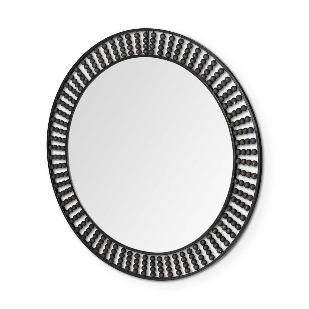 The 42-inch round mirror from Homeroots celebrates refined craftsmanship through elegant black metal framing adorned with natural wood beads. At 42 inches diameter, the substantial scale creates commanding focal point appropriate for primary bedrooms, living rooms, and spaces where circular geometry serves as architectural anchor. The beaded detail proves technically impressive; individual wood elements require precision positioning and attachment, indicating quality manufacturing and aesthetic consideration beyond basic frame assembly. Natural wood beads provide organic warmth and material texture contrasting beautifully with cool black metal, creating visual interest through material composition rather than relying on color contrast alone. This composite approach delivers sophisticated aesthetic suggesting designer consideration and investment in quality craftsmanship.