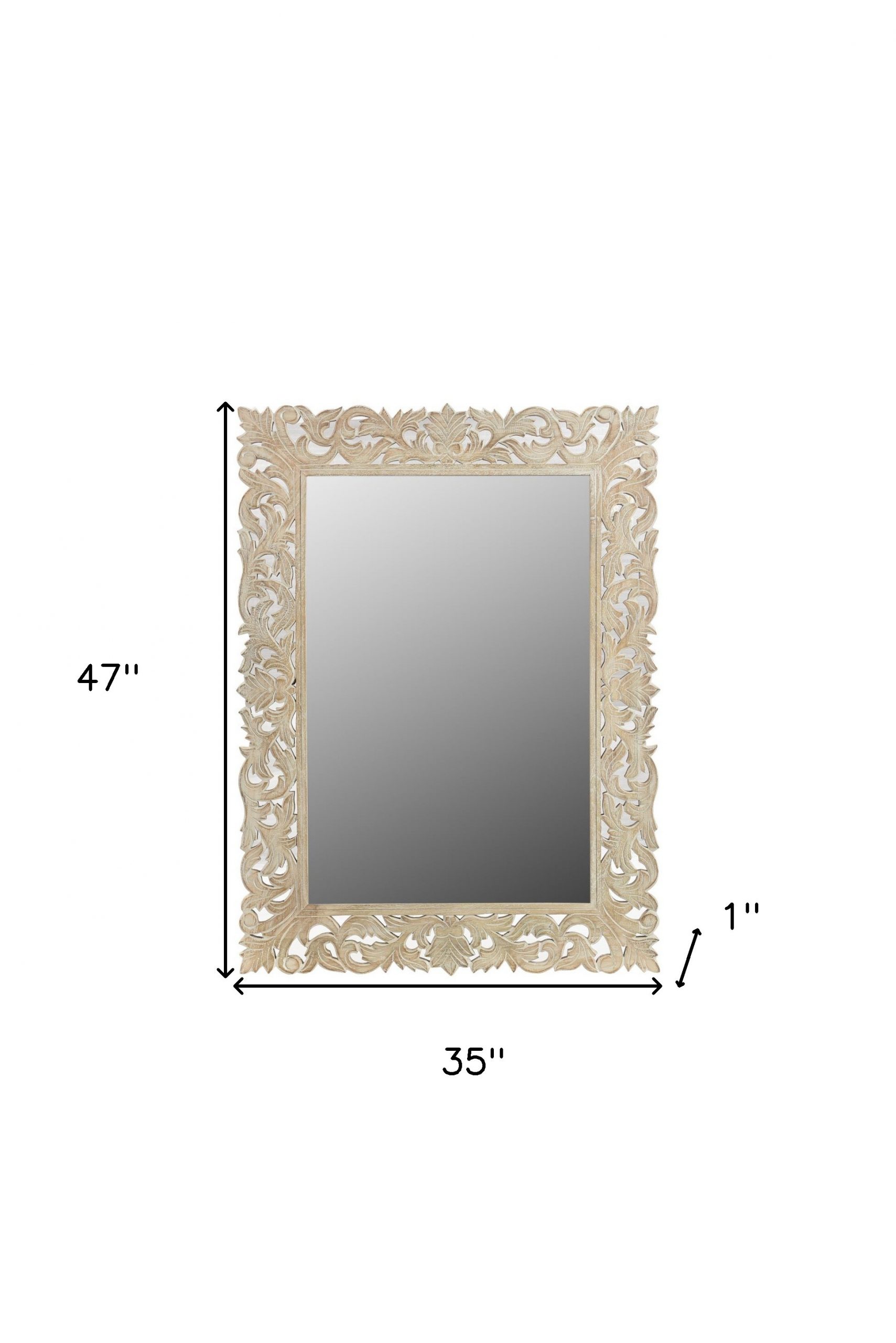 The elegantly crafted 47-inch antiqued white solid wood carved scrollwork accent mirror is what you need to add finishing touch to your decor. Surrounded by a gorgeous artisanal carved mango wood frame for a finished look, this mirror will bring practical style and design to your space. Its whitewashed and rustic style makes this mirror a favorite for bringing some flair to your decor. Features quality craftsmanship in every facet that ensures durability and long-lasting wear. 47-inch H x 35-inch W x 1-inch D