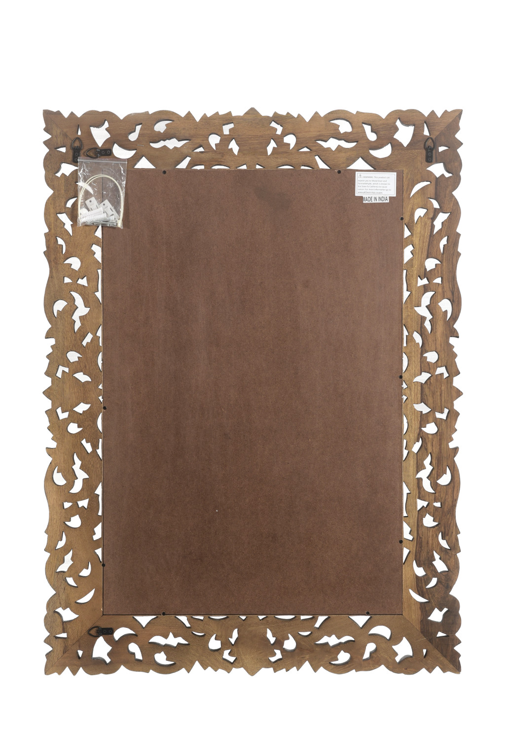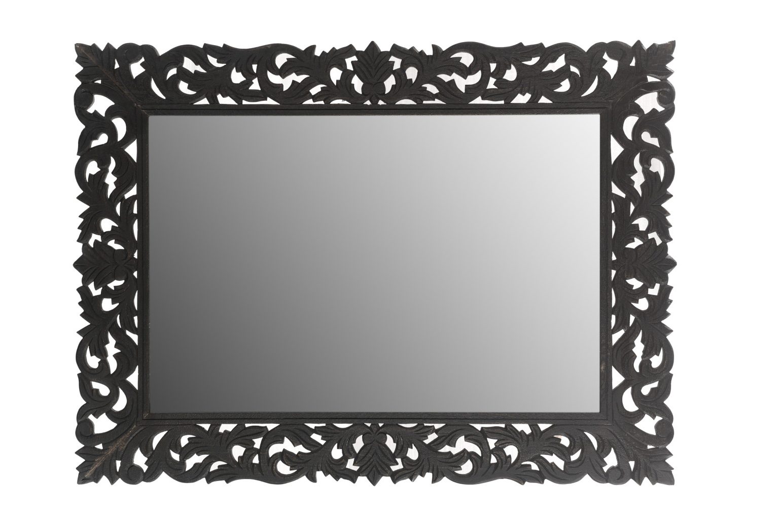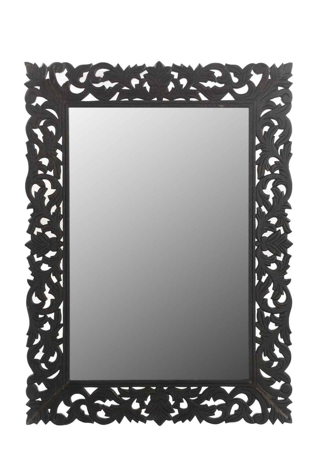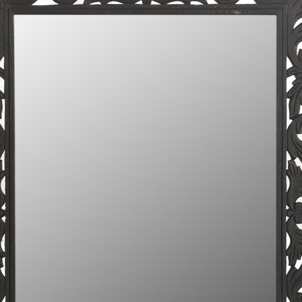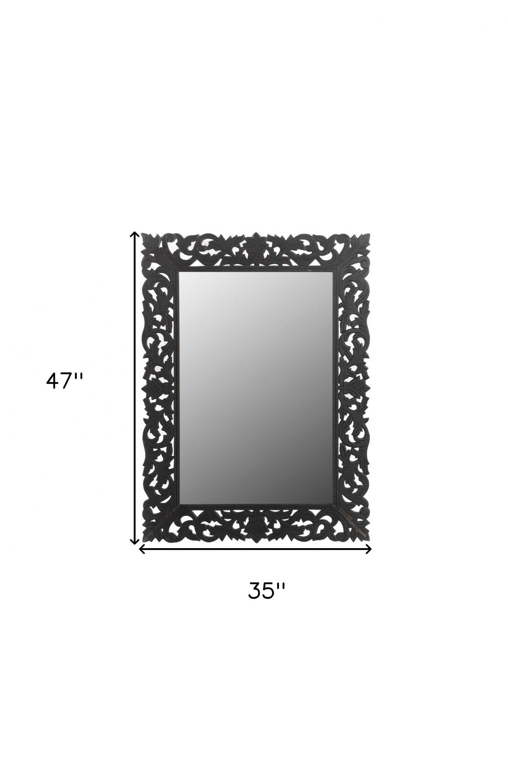 This 47-inch Black floral carved solid wood framed accent mirror is a decorative accent perfect for for most any room. This rectangle shaped mirror features beautiful carved floral cutwork that frames the glass in a charming and rustic style. Handcrafted from solid wood by true artisans, this piece is large in size to make a great focal point or centerpiece in your roo47-inch H x 35-inch W x 1-inch D