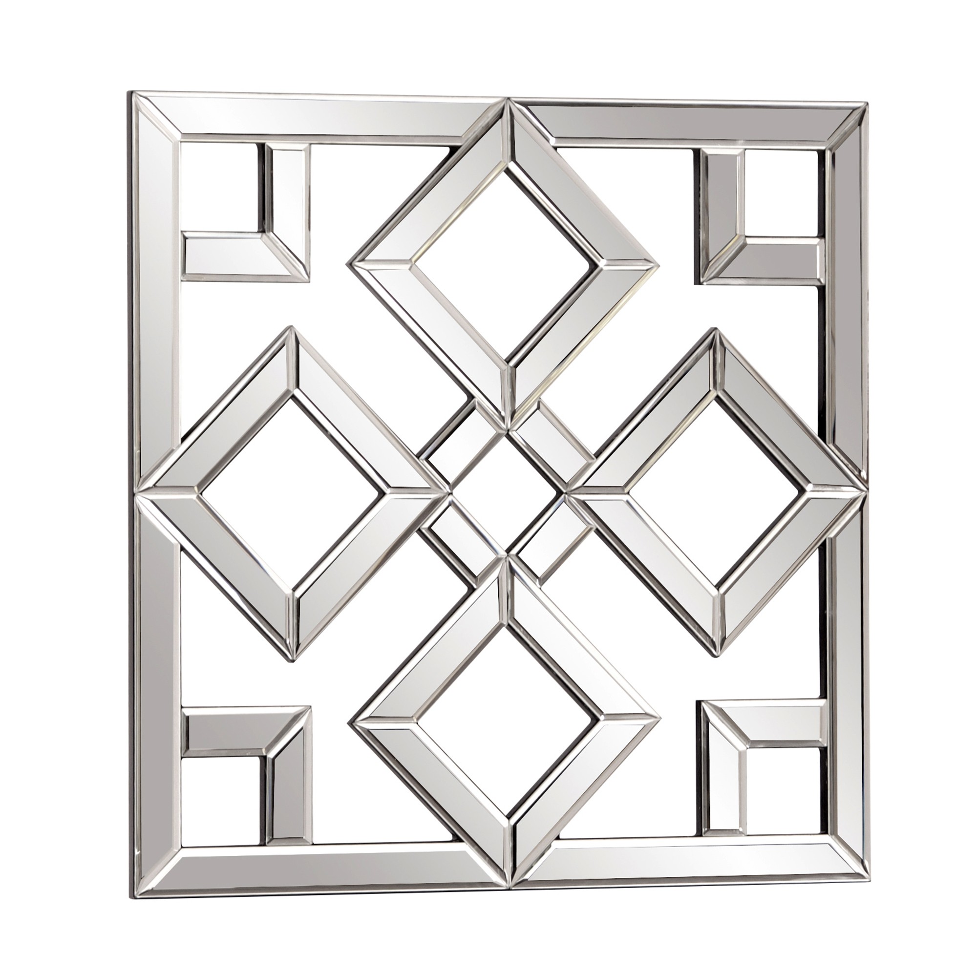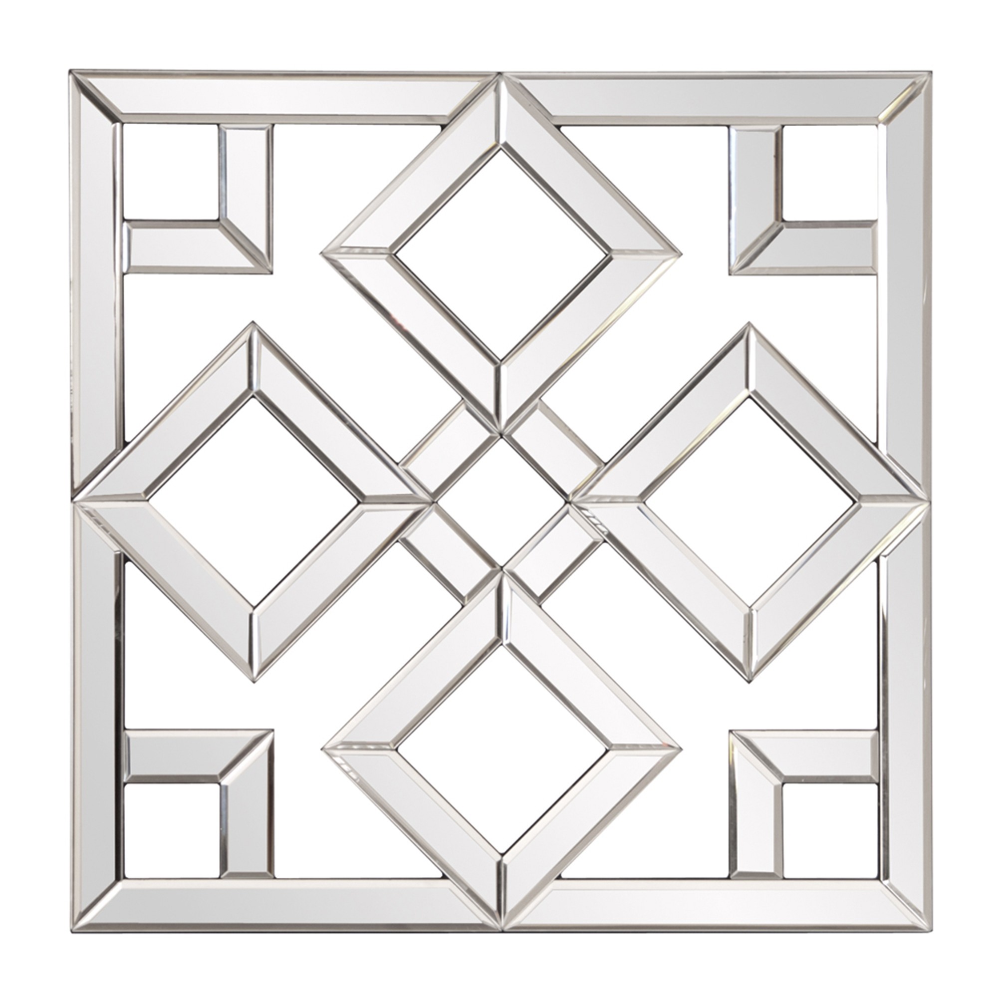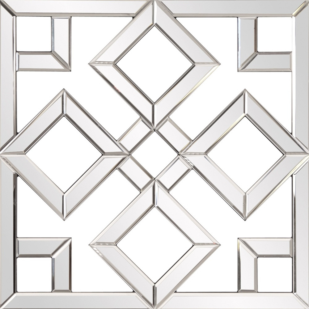 This mirror is a dazzling piece of geometric shapes. The piece is made up of a network of interlocking mirrored squares creating a lovely open work, lattice design. On its own or in multiples, this mirror is a perfect accent piece for an entryway, bathroom, bedroom or any room in your home. D-rings are affixed to the back of the mirror so it is ready to hang right out of the box in a square or diamond orientation! Each mirrored panel on this piece has a small bevel adding to its beauty and style