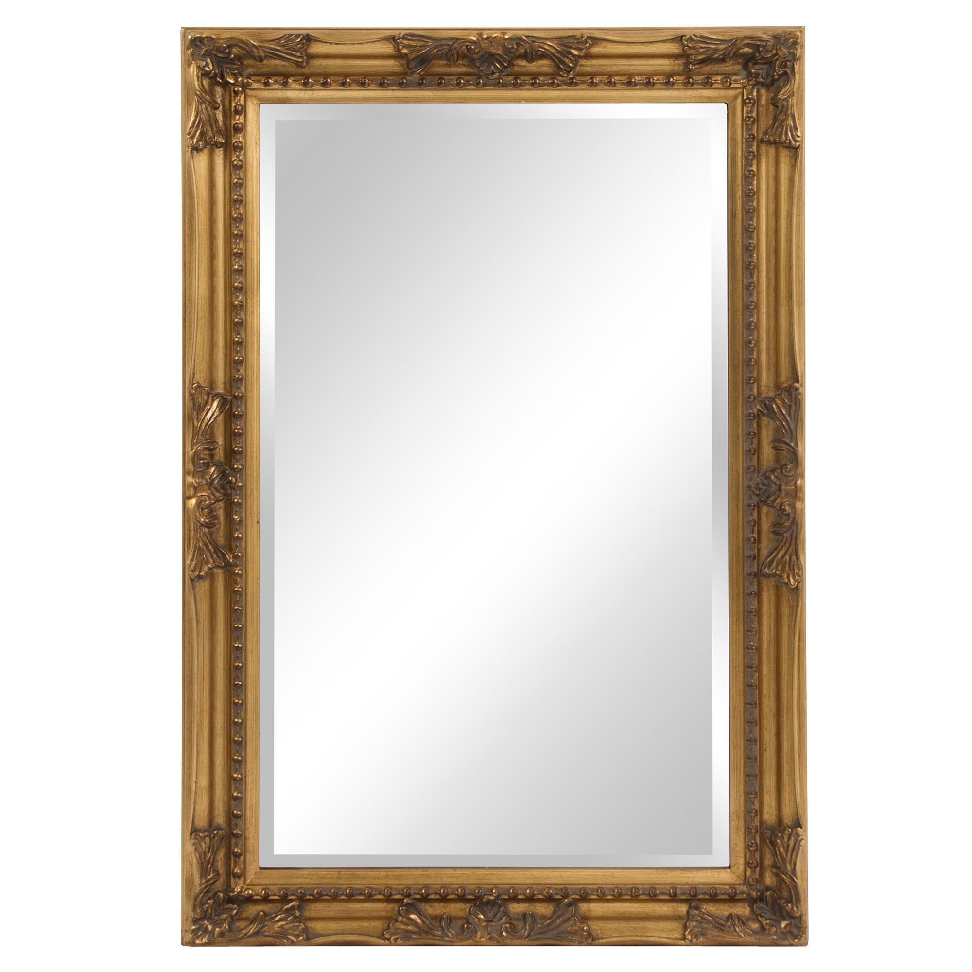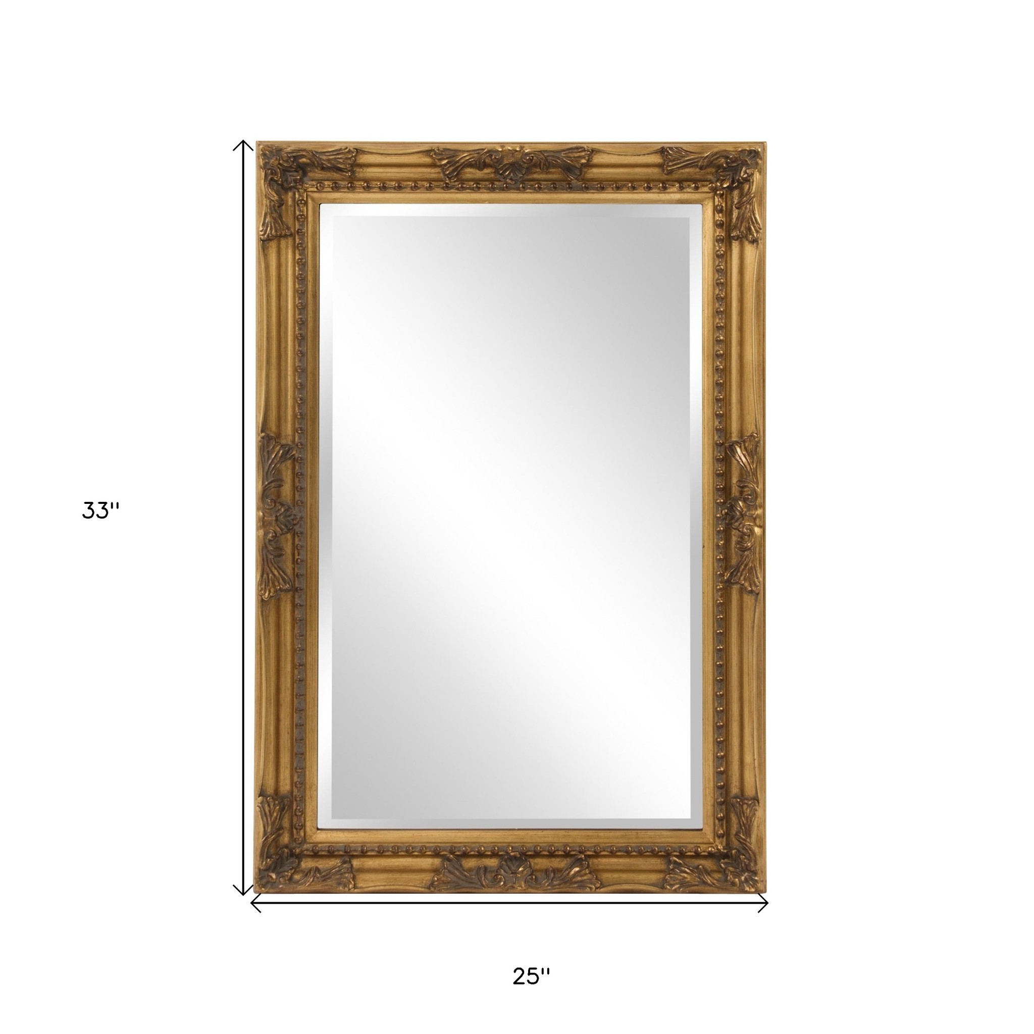 This mirror features an antique gold finish. The rectangular frame is made from wood and is accented with a beaded textured inset and decorative adornments on each side of the frame. For more added detail the mirror features a one inch bevel. Its traditional style makes this mirror a favorite for bringing some flair to your decor. This simple yet stunning piece would be a great addition to any room. It is a perfect focal point for an entryway, bathroom, bedroom or any room in your home. D-rings are affixed to the back of the mirror so it is ready to hang right out of the box in either a horizontal or vertical orientation! Also available in an oval shape.