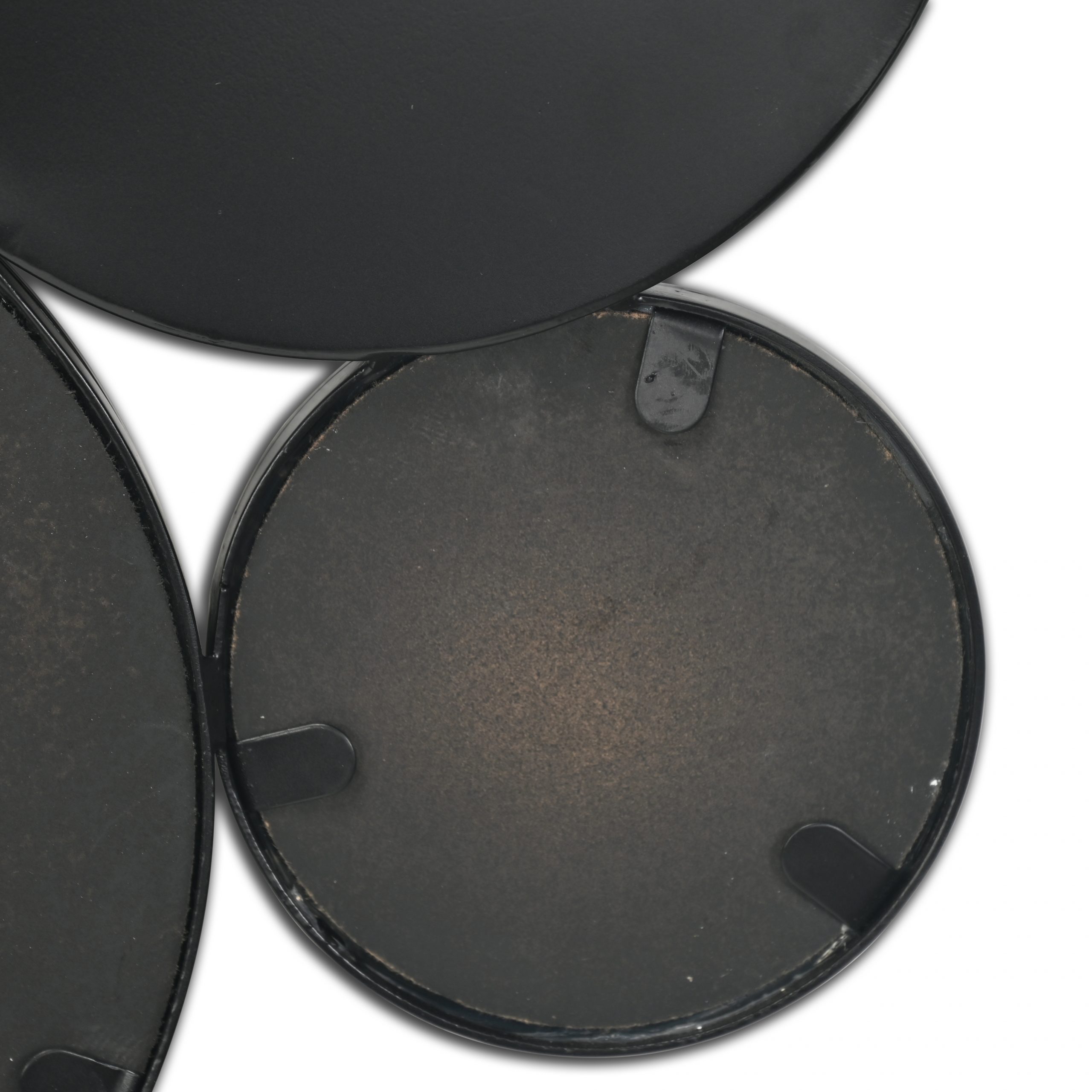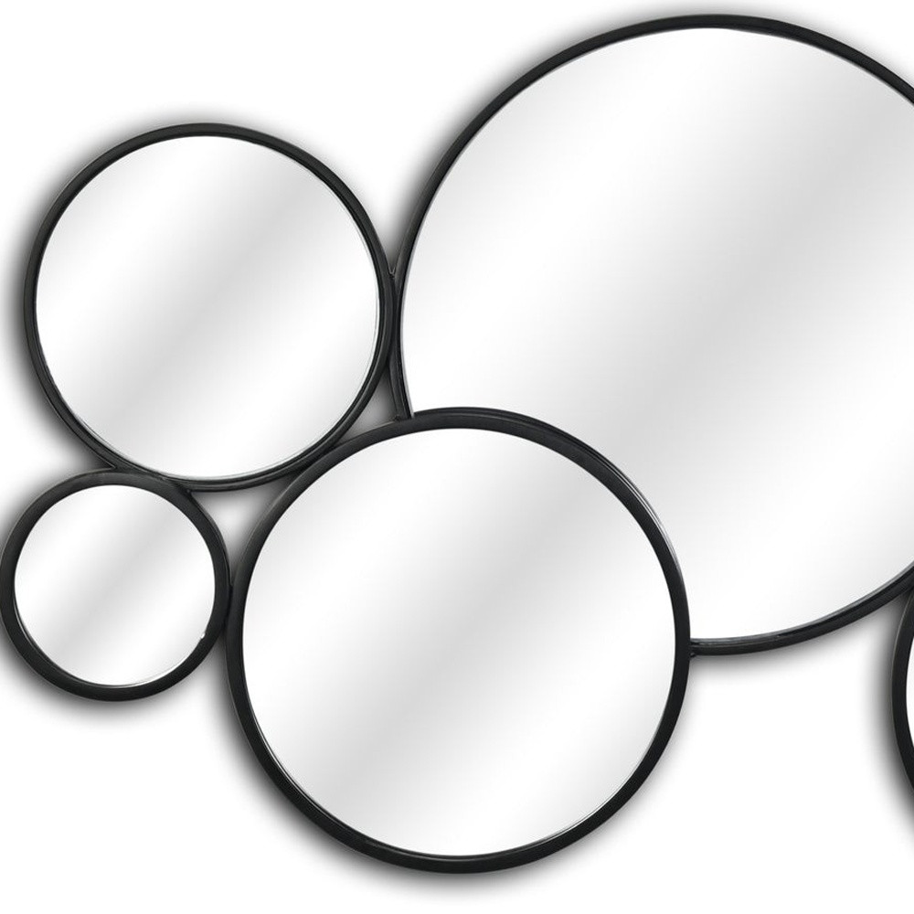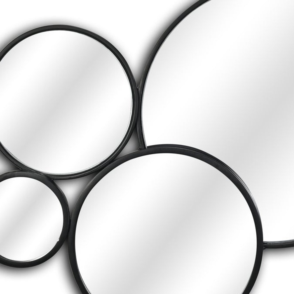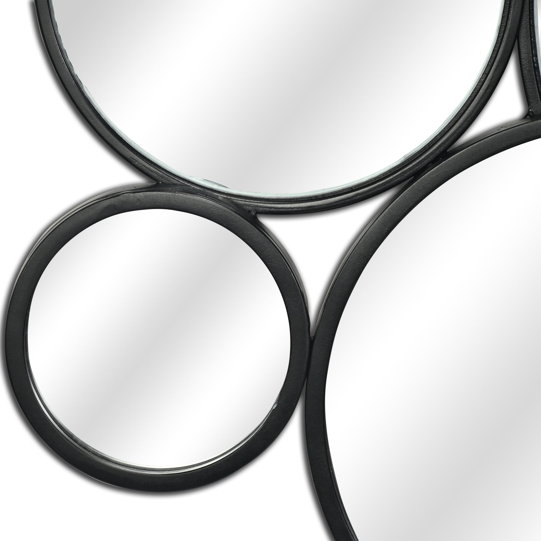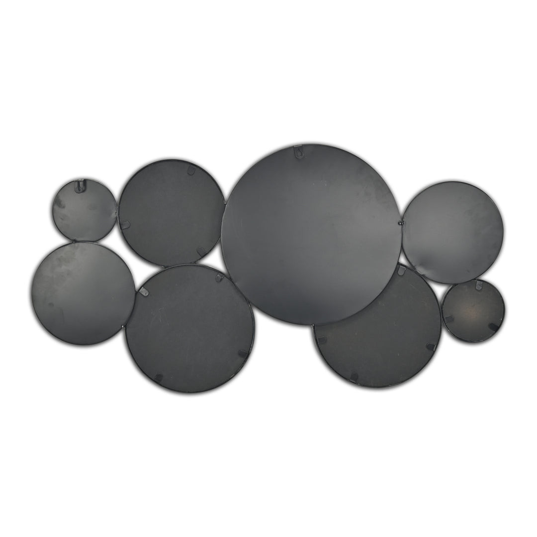 Add a touch of sunshine to any space in your home with this set of eight black metal round cojoined accent mirrors. Handcrafted with style, this modern mirror set will bring practical application and fashionable design to your space, Great for most any room, this set of various sized round mirrors will help to elevate your space with fashionable style. Produced with premium quality glass for a beautiful reflection, this mirror will provide an exceptional visual experience. 19-inch h x 36-inch w x 1.75-inch d.