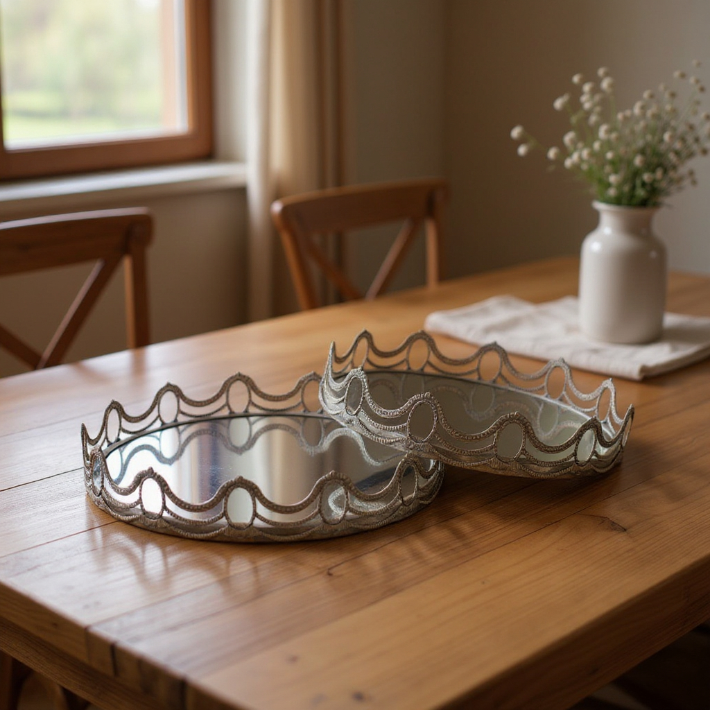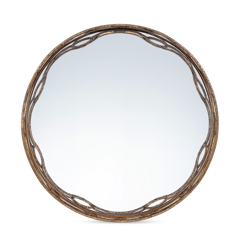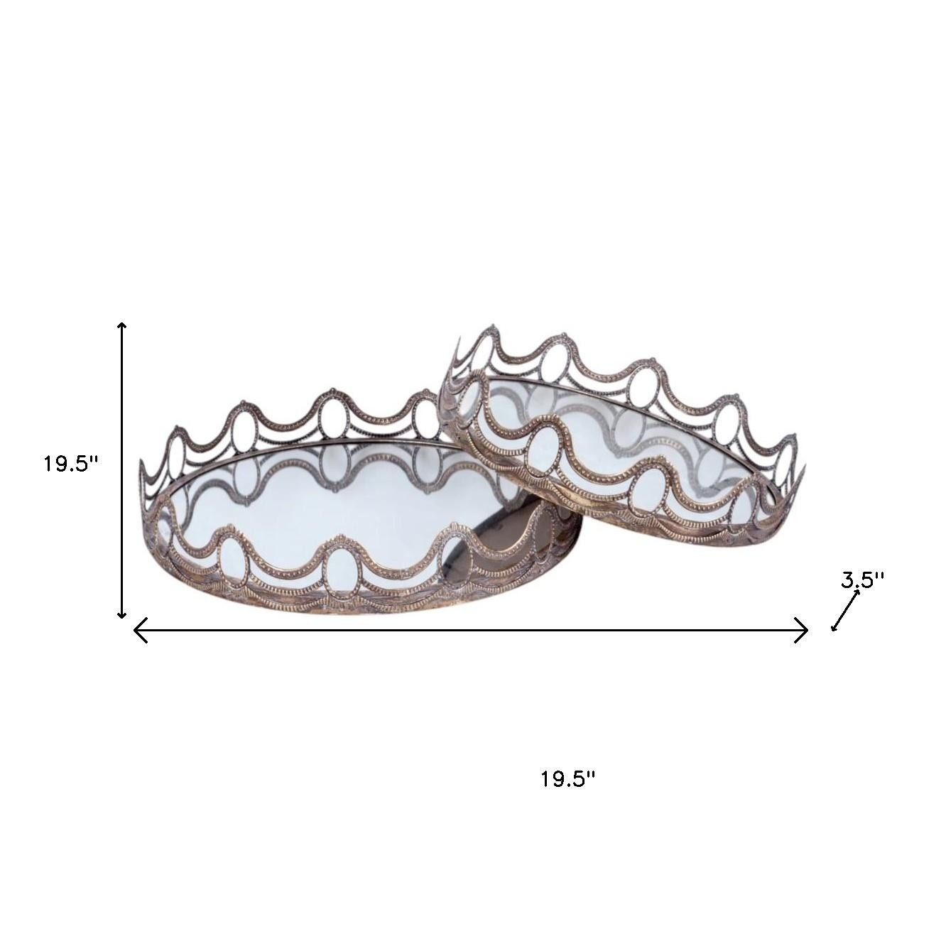 Beautify your space with this set of two gold round ornate framed accent mirrors. This unique set can be used as decorative vanity trays or display piece, but can also hang on the wall to create a stylish statement. With an ornate edge that resembles a crown and a distressed finish, these mirrors feature a truly unique and head turning design. Get creative and elevate your space with this decorative mirrored set. 19.50-inch h x 19.50-inch w x 3.50-inch d.