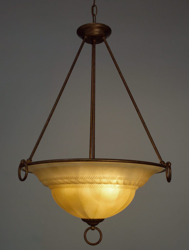 The perfect union of sculptured “melon” alabaster glass and empire design “rope” frames is traditional and timeless. Made in Italy.