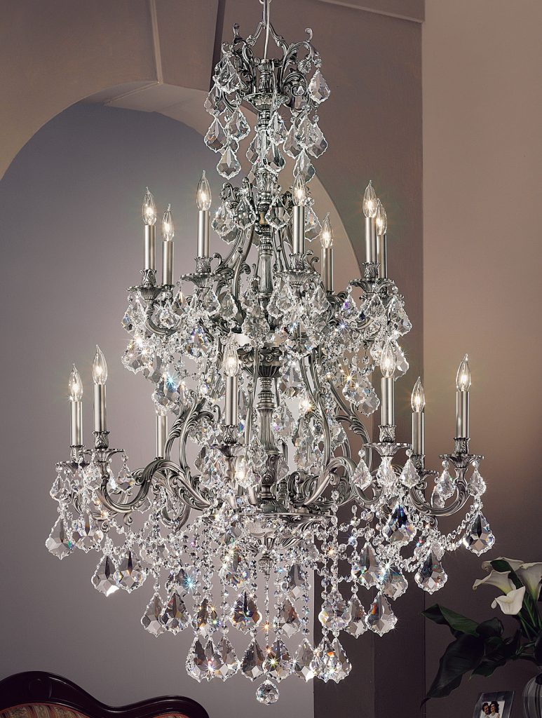 With the same metalwork as the first grouping, this collection is trimmed in the more traditional way with generous myriad of drapes and elongated chains of jewels and French Pendalogs making these truly “Imperial” looking.