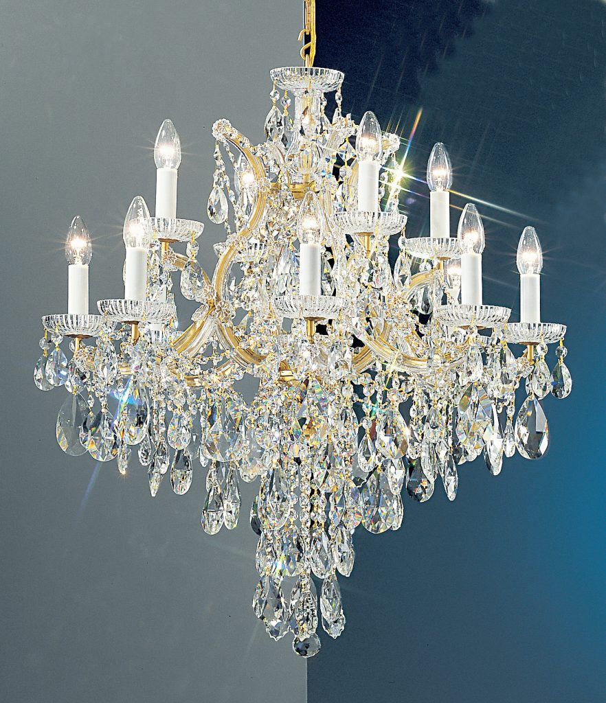The perfect marriage between old and new … Traditional Maria Theresa chandeliers and wall sconces trimmed with today’s highest quality Swarovski Elements, Spectra or more economical hand cut and polished Crystalique crystal produces a real look of elegance that will last for years to come. All Olde World Gold items illustrated can be ordered in Chrome (CH) finish.