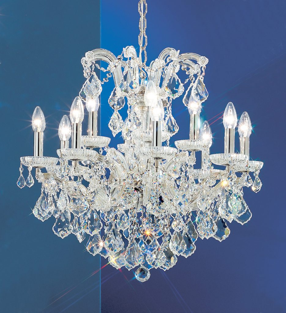 The perfect marriage between old and new … Traditional Maria Theresa chandeliers and wall sconces trimmed with today’s highest quality Swarovski Elements, Spectra or more economical hand cut and polished Crystalique crystal produces a real look of elegance that will last for years to come. All Olde World Gold items illustrated can be ordered in Chrome (CH) finish.