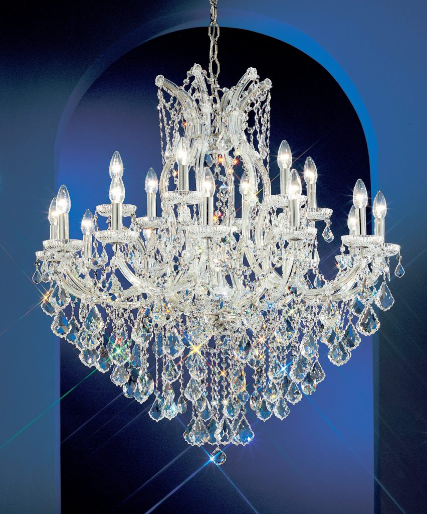 The perfect marriage between old and new … Traditional Maria Theresa chandeliers and wall sconces trimmed with today’s highest quality Swarovski Elements, Spectra or more economical hand cut and polished Crystalique crystal produces a real look of elegance that will last for years to come. All Olde World Gold items illustrated can be ordered in Chrome (CH) finish.