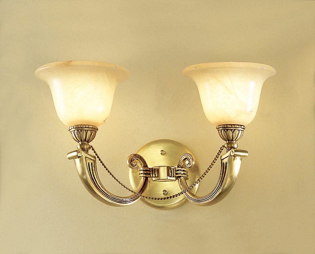 The Monica collection features a Romanesque design cleverly accented with natural alabaster veneers in the body and column then draped with decorative beaded chains. The “bell” shaped shades complete the all-alabaster look.