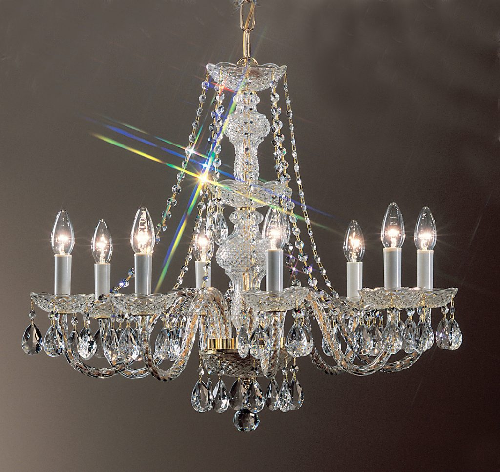 All-glass chandeliers generously adorned with a combination of French Pendalogs, almond cut prisms and elongated chains make this series very desirable yet most affordable.