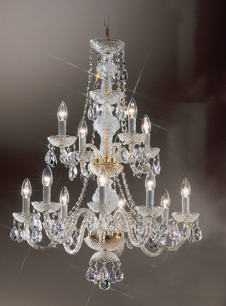 All-glass chandeliers generously adorned with a combination of French Pendalogs, almond cut prisms and elongated chains make this series very desirable yet most affordable.