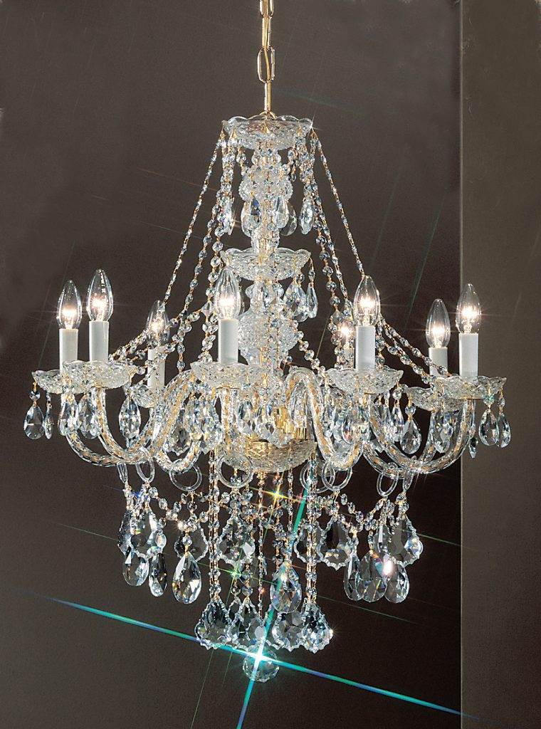 All-glass chandeliers generously adorned with a combination of French Pendalogs, almond cut prisms and elongated chains make this series very desirable yet most affordable.