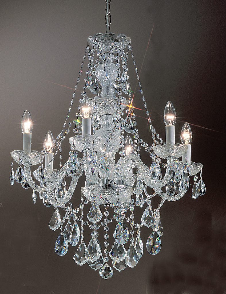 All-glass chandeliers generously adorned with a combination of French Pendalogs, almond cut prisms and elongated chains make this series very desirable yet most affordable.